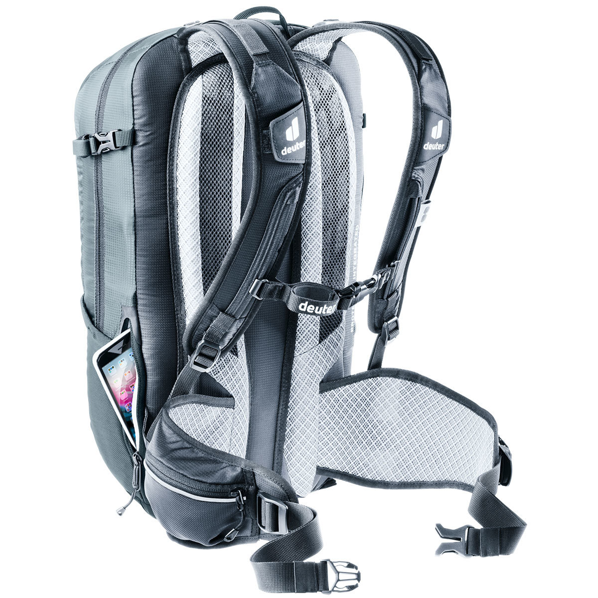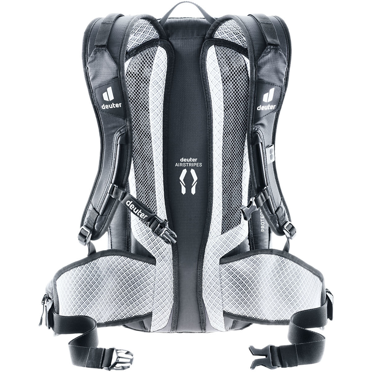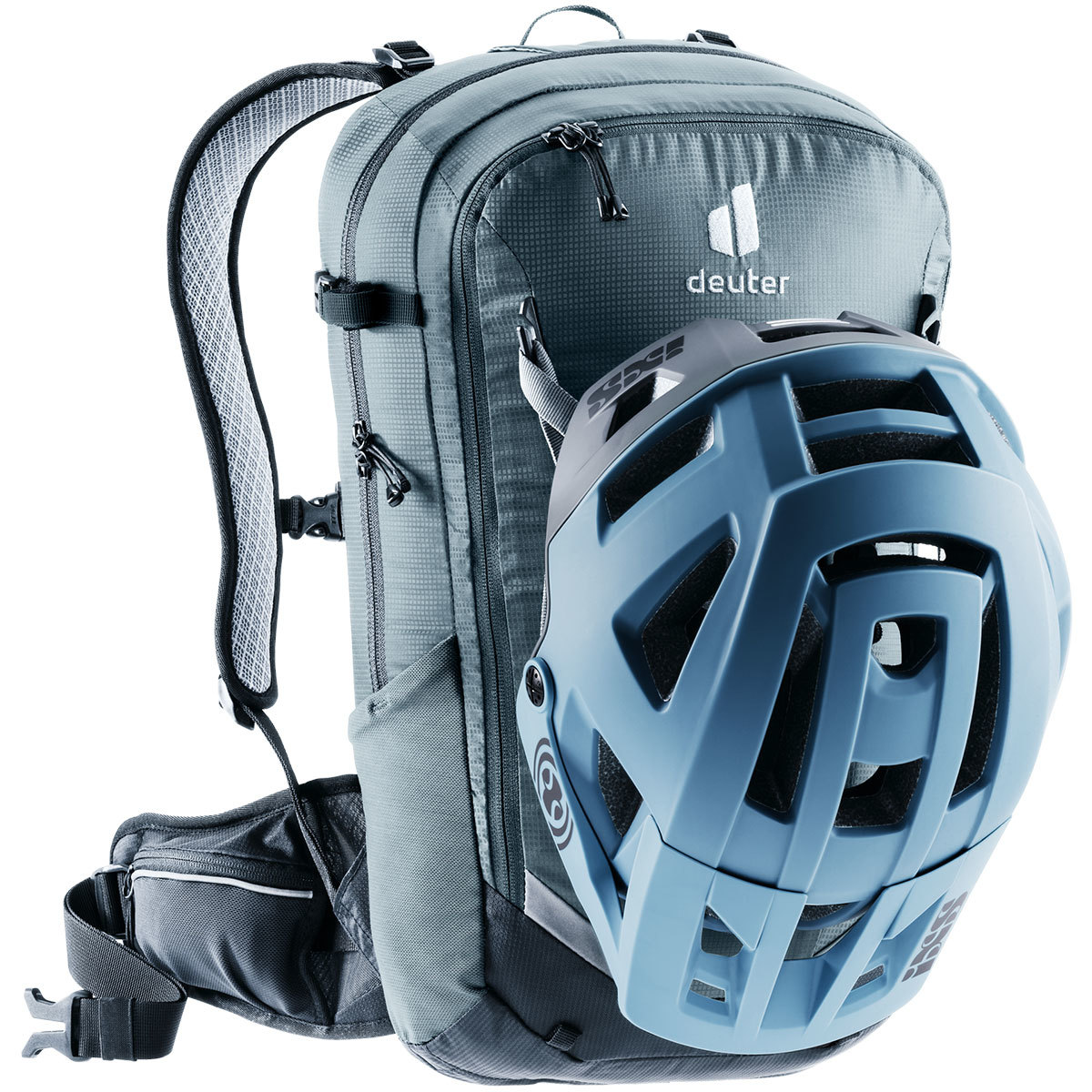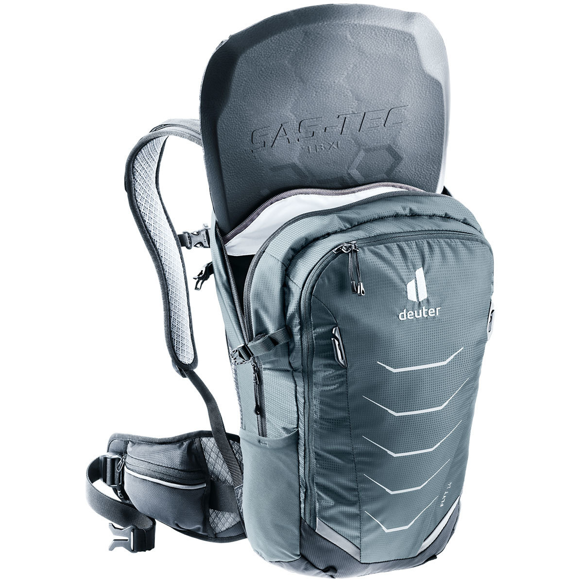 De deuter Compact Flyt 14 Fietsrugzak is een compacte en comfortabele rugzak die ontworpen is voor het mountainbiken. De deuter Compact Flut 14 Fietsrugzak is een compacte en comfortabele rugzak die ontworpen is voor het mountainbiken. De deuter Compact Flut 14 Fietsrugzak is een compacte en comfortabele rugzak die ontworpen is voor het mountainbiken. Dankzij de uitstekende ventilatie op het rugpand, en de ontelbare opbergmogelijkheden kan je op een comfortabele manier al je essentials meenemen. Het slanke design laat de rugzak compact en stabiel aanvoelen. Het rugpand is voorzien van het Airstripes rugsysteem, en heeft dus een innovatieve foam padding en luchtkanalen voor een goede ventilatie. Naast het zeer goed ademende rugpand, zijn ook de schouderriemen met Mesh gevoerd, voor een nog beter ademend vermogen. Daarnaast bieden ze voldoende bewegingsvrijheid. De DWR coating voorziet de tas van een waterafstotende laag, zodat vocht niet naar binnen dringt. De tas is vrij van polyfluorchemicaliën, waardoor er minder milieubelastende stoffen gebruikt zijn bij het produceren van deze tas. De reflecterende elementen zorgen ervoor dat je ook in donkere omstandigheden goed zichtbaar bent, en daarnaast kan je aan de lus op de voorzijde een achterlicht bevestigen.