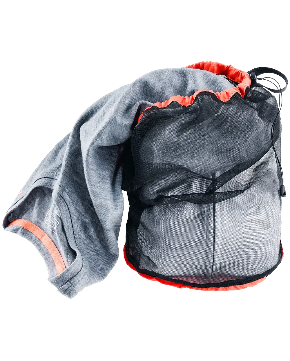 De tas is voorzien van een functioneel trekkoord voor een stevige sluiting en blijft compact en eenvoudig in gebruik. Dankzij de handgreep en twee ophanglussen kan de tas gemakkelijk worden gedragen of opgehangen. De Mesh Sack is gemaakt van 100 procent gerecycled PET en is volledig PFC-vrij, wat bijdraagt aan een duurzamere en milieuvriendelijke keuze.