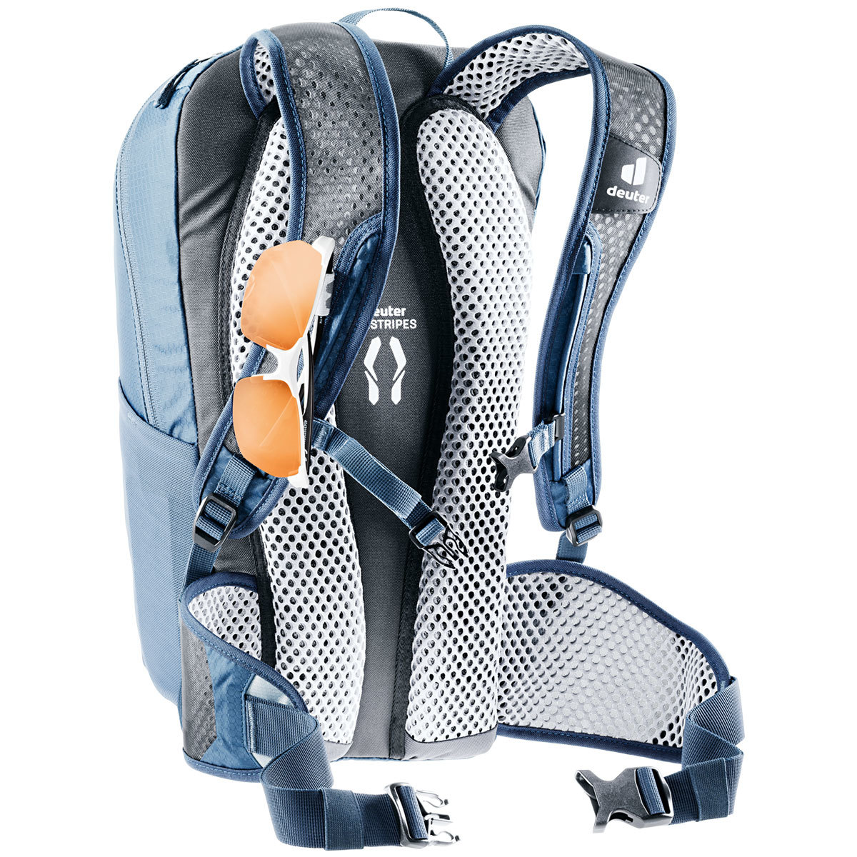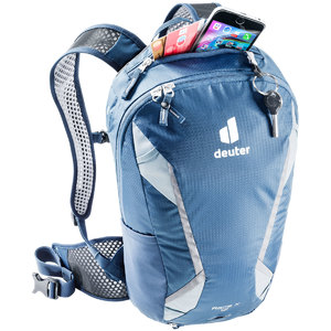 De deuter Race X Fietsrugzak is een extreem comfortabele rugzak met een zeer laag gewicht. Dankzij de uitstekende ventilatie op het rugpand, en de vele opbergmogelijkheden kan je op een comfortabele manier je belangrijkste essentials meenemen. Het slanke design laat de rugzak compact en stabiel aanvoelen. Het rugpand is voorzien van het Airstripes rugsysteem, en heeft dus een innovatieve foam padding en luchtkanalen voor een goede ventilatie. Naast het zeer goed ademende rugpand, zijn ook de schouderriemen met Mesh gevoerd, voor een nog beter ademend vermogen. Daarnaast bieden ze voldoende bewegingsvrijheid. Je helm kan je gemakkelijk aan de voorzijde van de tas bevestigen, zodat deze geen ruimte inneemt in de tas. Wanneer je toch meer ruimte nodig hebt, is het volume van de tas in een oogwenk uit te breiden. De DWR coating voorziet de tas van een waterafstotende laag, zodat vocht niet naar binnen dringt. De tas is vrij van polyfluorchemicaliën, waardoor er minder milieubelastende stoffen gebruikt zijn bij het produceren van deze tas. De reflecterende elementen zorgen ervoor dat je ook in donkere omstandigheden goed zichtbaar bent, en daarnaast kan je aan de lus op de voorzijde een achterlicht bevestigen.