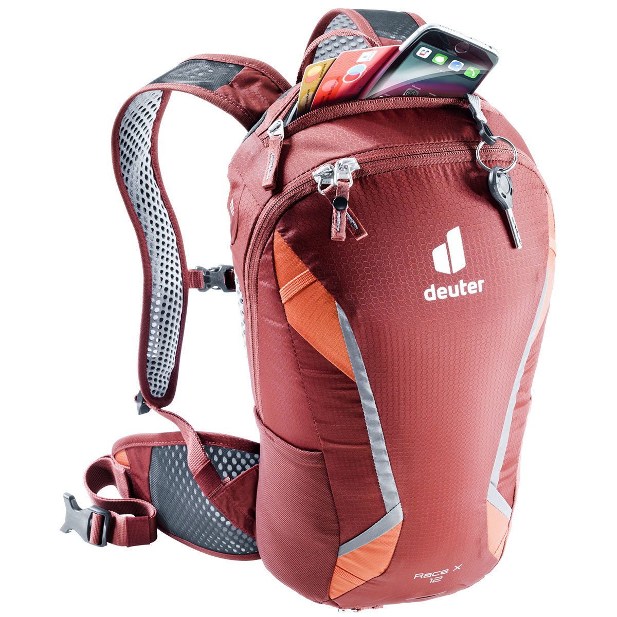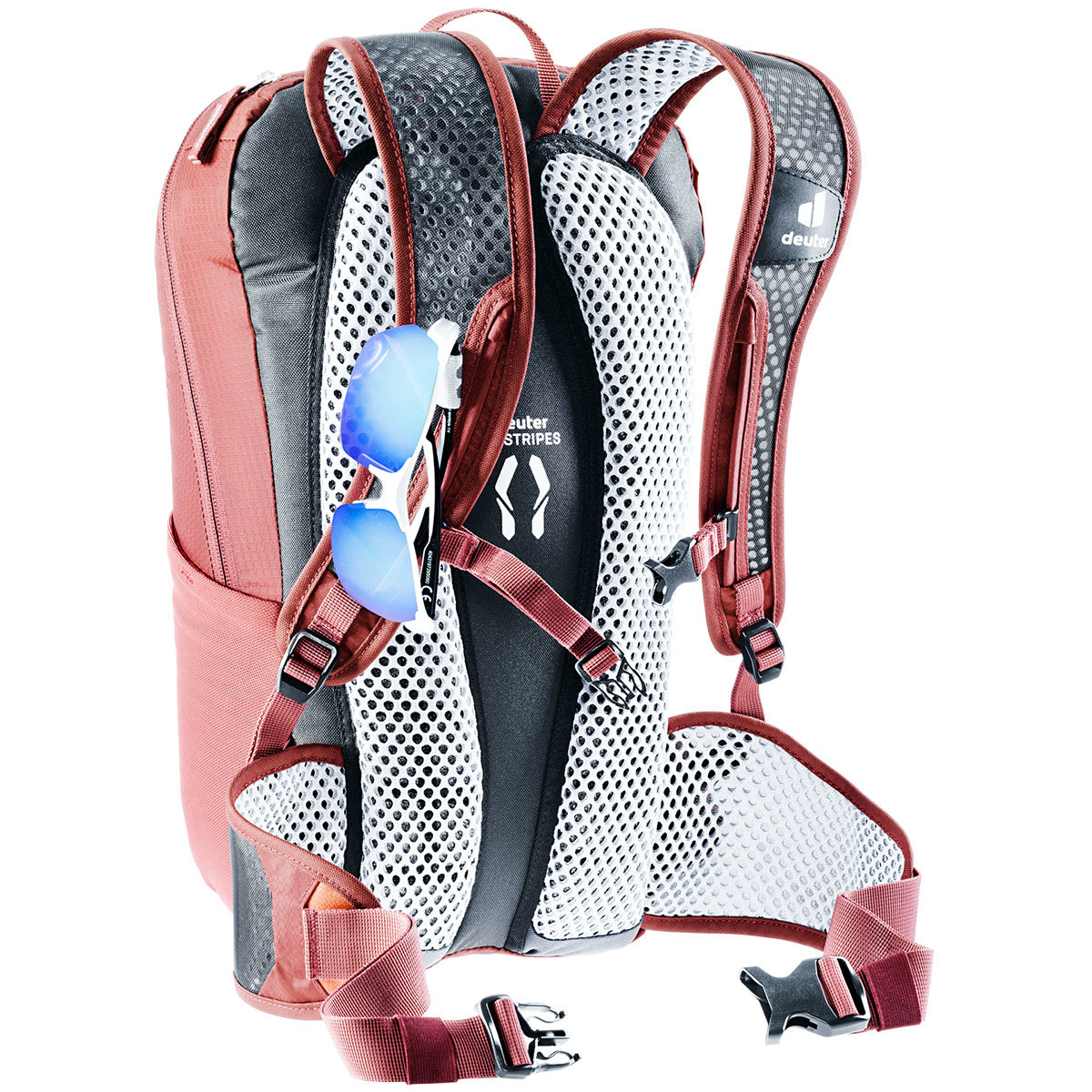 De deuter Race X Fietsrugzak is een extreem comfortabele rugzak met een zeer laag gewicht. Dankzij de uitstekende ventilatie op het rugpand, en de vele opbergmogelijkheden kan je op een comfortabele manier je belangrijkste essentials meenemen. Het slanke design laat de rugzak compact en stabiel aanvoelen. Het rugpand is voorzien van het Airstripes rugsysteem, en heeft dus een innovatieve foam padding en luchtkanalen voor een goede ventilatie. Naast het zeer goed ademende rugpand, zijn ook de schouderriemen met Mesh gevoerd, voor een nog beter ademend vermogen. Daarnaast bieden ze voldoende bewegingsvrijheid. Je helm kan je gemakkelijk aan de voorzijde van de tas bevestigen, zodat deze geen ruimte inneemt in de tas. Wanneer je toch meer ruimte nodig hebt, is het volume van de tas in een oogwenk uit te breiden. De DWR coating voorziet de tas van een waterafstotende laag, zodat vocht niet naar binnen dringt. De tas is vrij van polyfluorchemicaliën, waardoor er minder milieubelastende stoffen gebruikt zijn bij het produceren van deze tas. De reflecterende elementen zorgen ervoor dat je ook in donkere omstandigheden goed zichtbaar bent, en daarnaast kan je aan de lus op de voorzijde een achterlicht bevestigen.