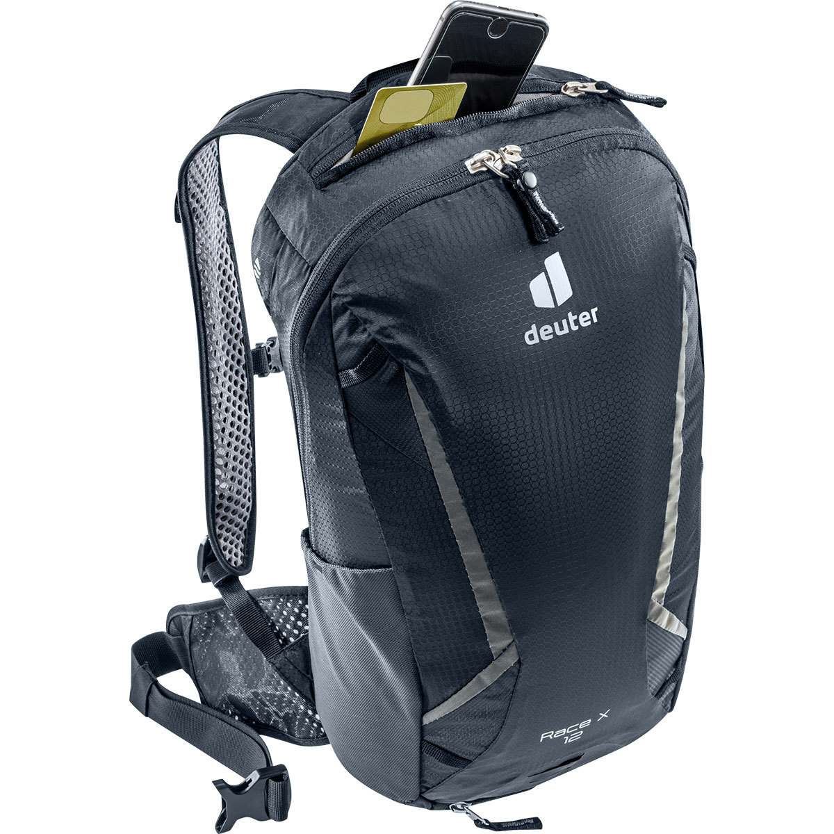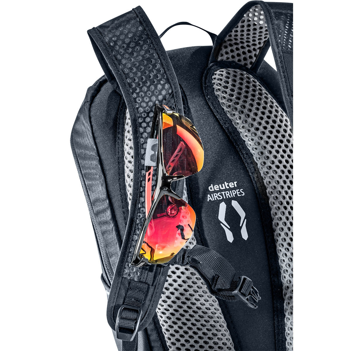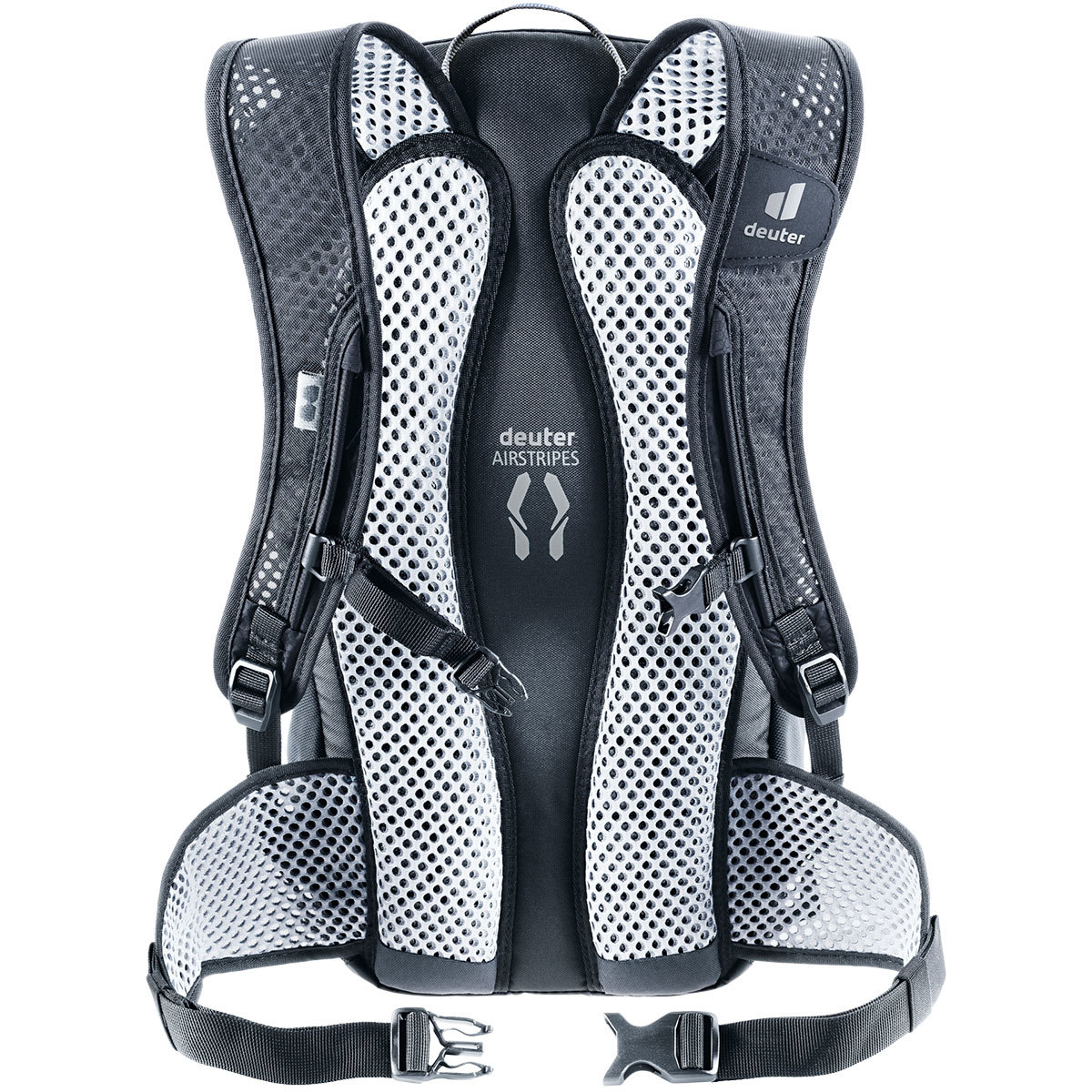 De deuter Race X Fietsrugzak is een extreem comfortabele rugzak met een zeer laag gewicht. Dankzij de uitstekende ventilatie op het rugpand, en de vele opbergmogelijkheden kan je op een comfortabele manier je belangrijkste essentials meenemen. Het slanke design laat de rugzak compact en stabiel aanvoelen. Het rugpand is voorzien van het Airstripes rugsysteem, en heeft dus een innovatieve foam padding en luchtkanalen voor een goede ventilatie. Naast het zeer goed ademende rugpand, zijn ook de schouderriemen met Mesh gevoerd, voor een nog beter ademend vermogen. Daarnaast bieden ze voldoende bewegingsvrijheid. Je helm kan je gemakkelijk aan de voorzijde van de tas bevestigen, zodat deze geen ruimte inneemt in de tas. Wanneer je toch meer ruimte nodig hebt, is het volume van de tas in een oogwenk uit te breiden. De DWR coating voorziet de tas van een waterafstotende laag, zodat vocht niet naar binnen dringt. De tas is vrij van polyfluorchemicaliën, waardoor er minder milieubelastende stoffen gebruikt zijn bij het produceren van deze tas. De reflecterende elementen zorgen ervoor dat je ook in donkere omstandigheden goed zichtbaar bent, en daarnaast kan je aan de lus op de voorzijde een achterlicht bevestigen.