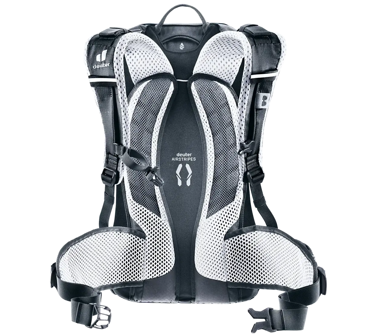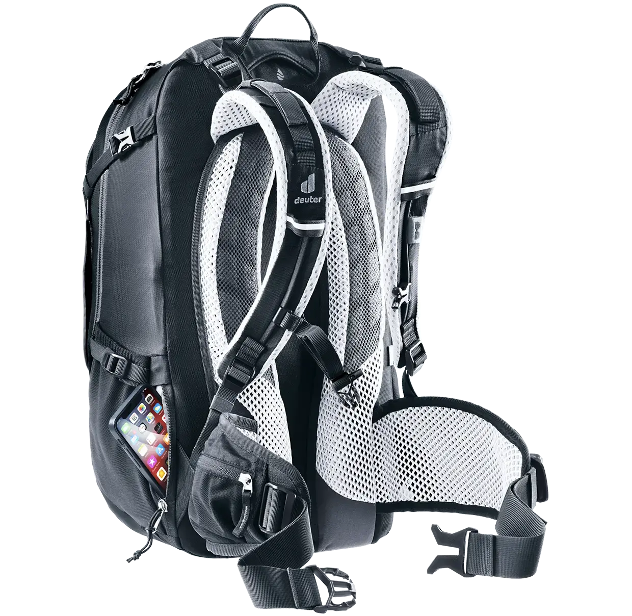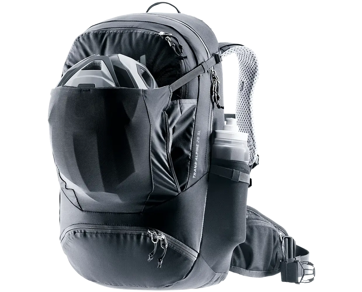 De deuter Trans Alpine 28 SL Fietsrugzak is een extreem comfortabele rugzak. Deze SL versie is speciaal ontworpen voor dames. De straps zijn bijvoorbeeld anders geplaatst en hebben de juiste lengte voor dames. Dankzij de uitstekende ventilatie op het rugpand, en de ontelbare opbergmogelijkheden kan je op een comfortabele manier al je essentials meenemen. Het slanke design laat de rugzak compact en stabiel aanvoelen. Naast het zeer goed ademende rugpand, zijn ook de schouderriemen met Mesh gevoerd, voor een nog beter ademend vermogen. Daarnaast bieden ze voldoende bewegingsvrijheid. Je helm kan je gemakkelijk aan de voorzijde van de tas bevestigen, zodat deze geen ruimte inneemt in de tas. De DWR coating voorziet de tas van een waterafstotende laag, zodat vocht niet naar binnen dringt. De tas is vrij van polyfluorchemicaliën, waardoor er minder milieubelastende stoffen gebruikt zijn bij het produceren van deze tas.