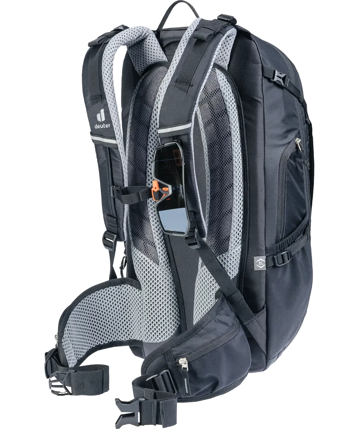 De deuter Trans Alpine 32 EL Fietsrugzak is een extreem comfortabele rugzak. Dankzij de uitstekende ventilatie op het rugpand, en de ontelbare opbergmogelijkheden kan je op een comfortabele manier al je essentials meenemen. Het slanke design laat de rugzak compact en stabiel aanvoelen. Naast het zeer goed ademende rugpand, zijn ook de schouderriemen met Mesh gevoerd, voor een nog beter ademend vermogen. Daarnaast bieden ze voldoende bewegingsvrijheid. Je helm kan je gemakkelijk aan de voorzijde van de tas bevestigen, zodat deze geen ruimte inneemt in de tas. De DWR coating voorziet de tas van een waterafstotende laag, zodat vocht niet naar binnen dringt. De tas is vrij van polyfluorchemicaliën, waardoor er minder milieubelastende stoffen gebruikt zijn bij het produceren van deze tas.