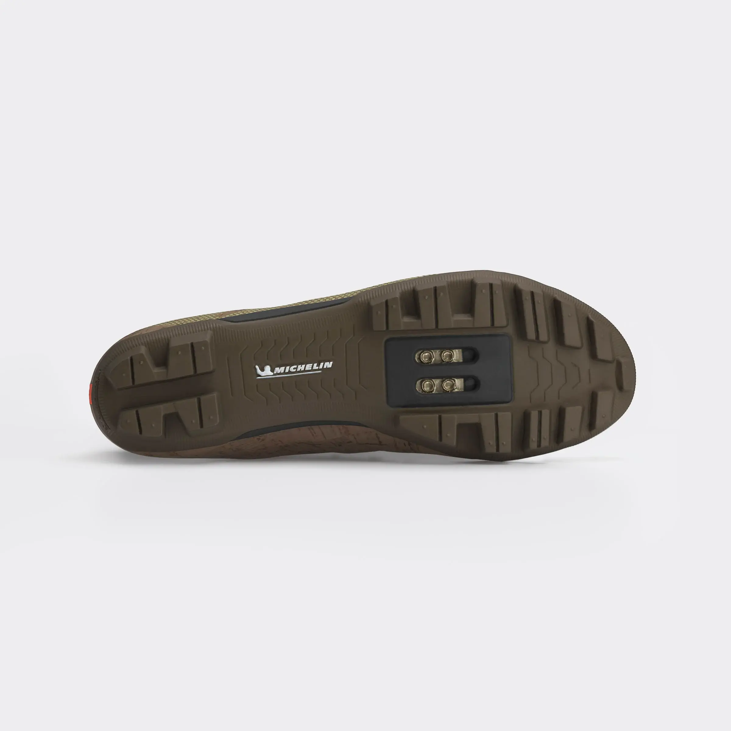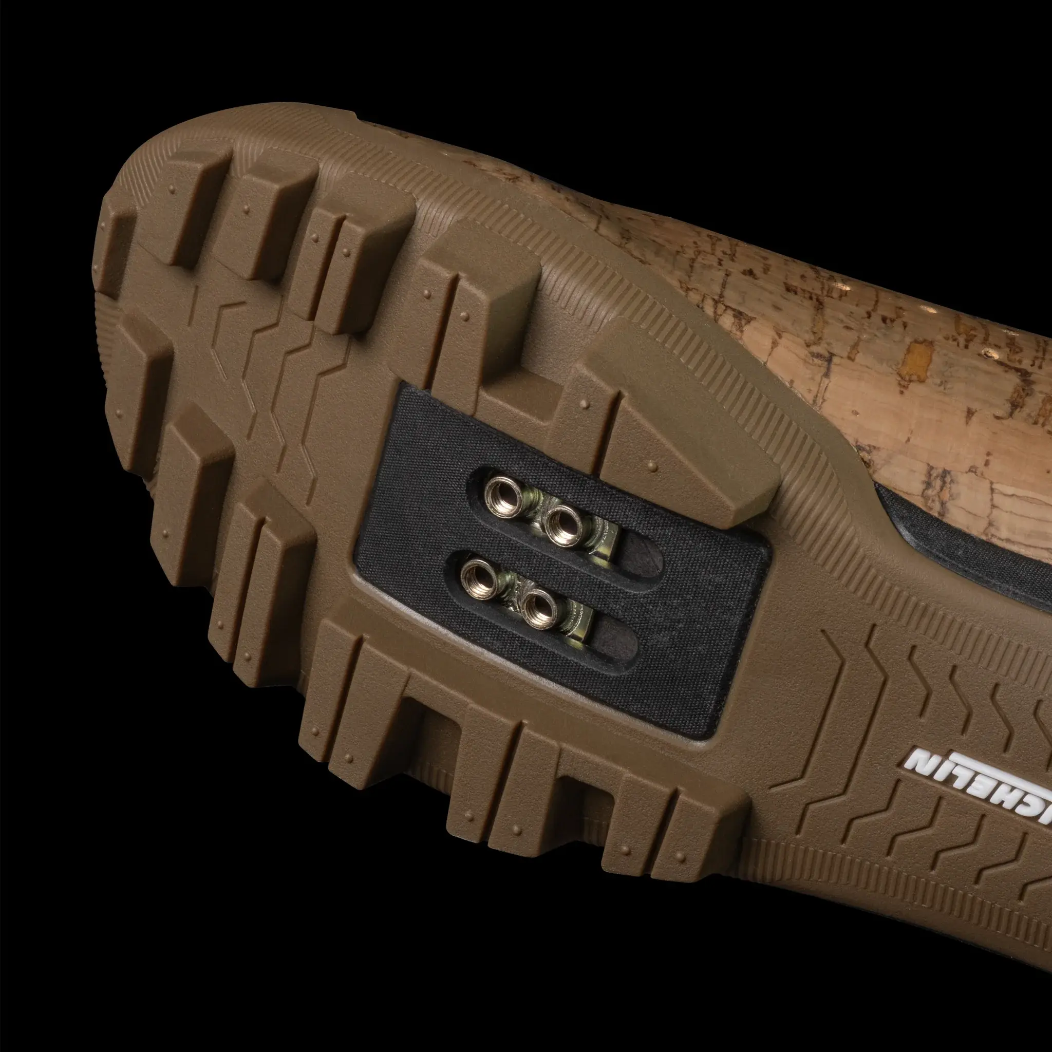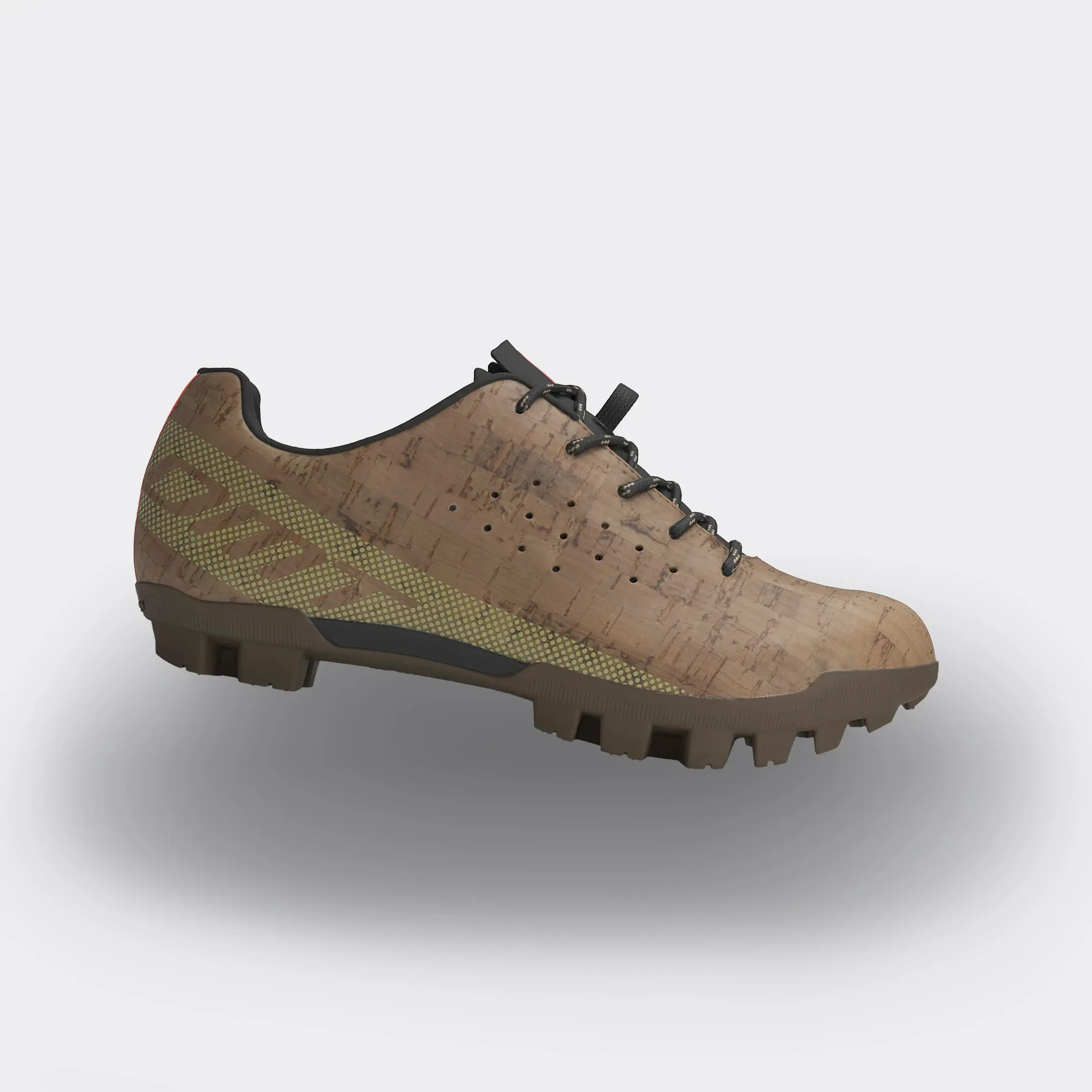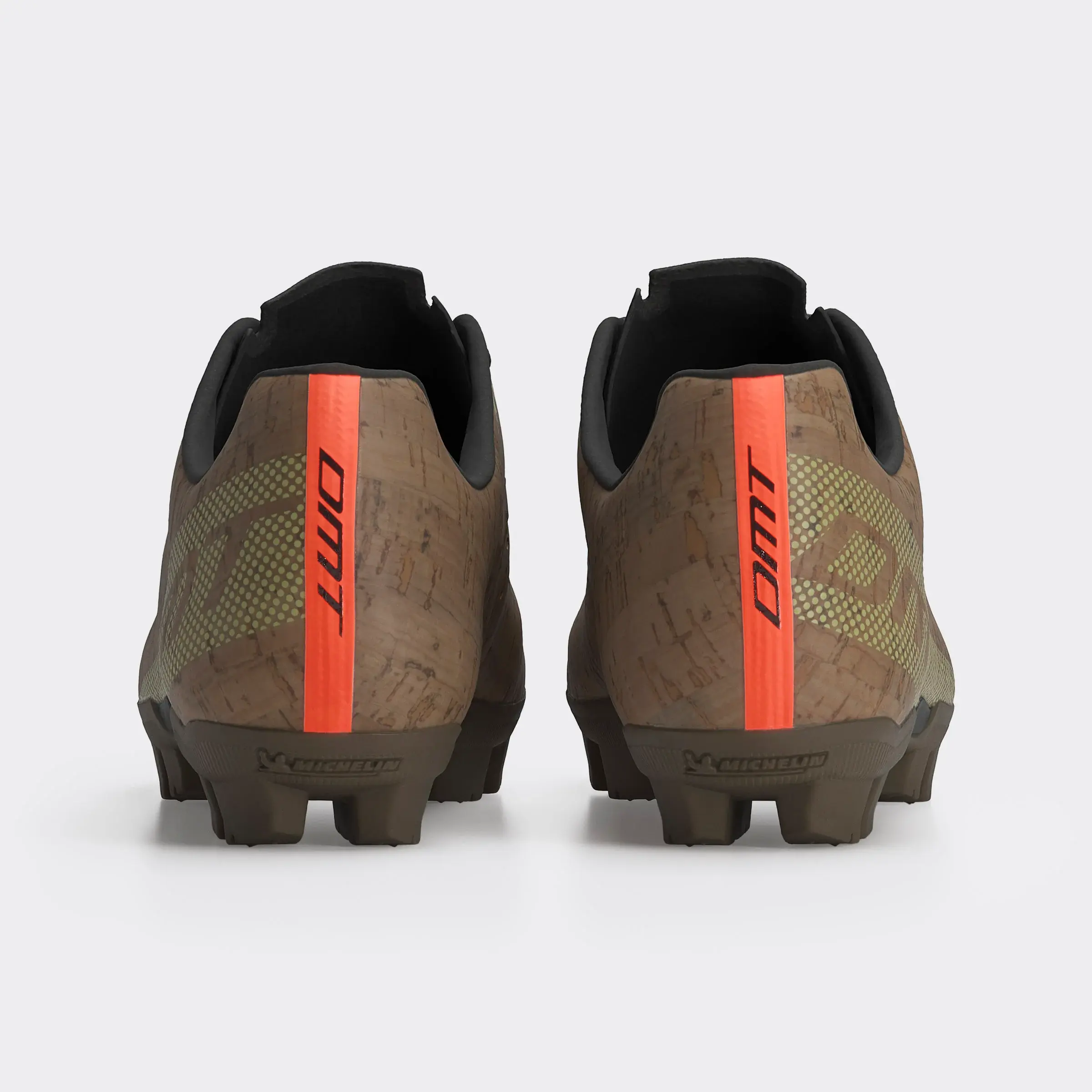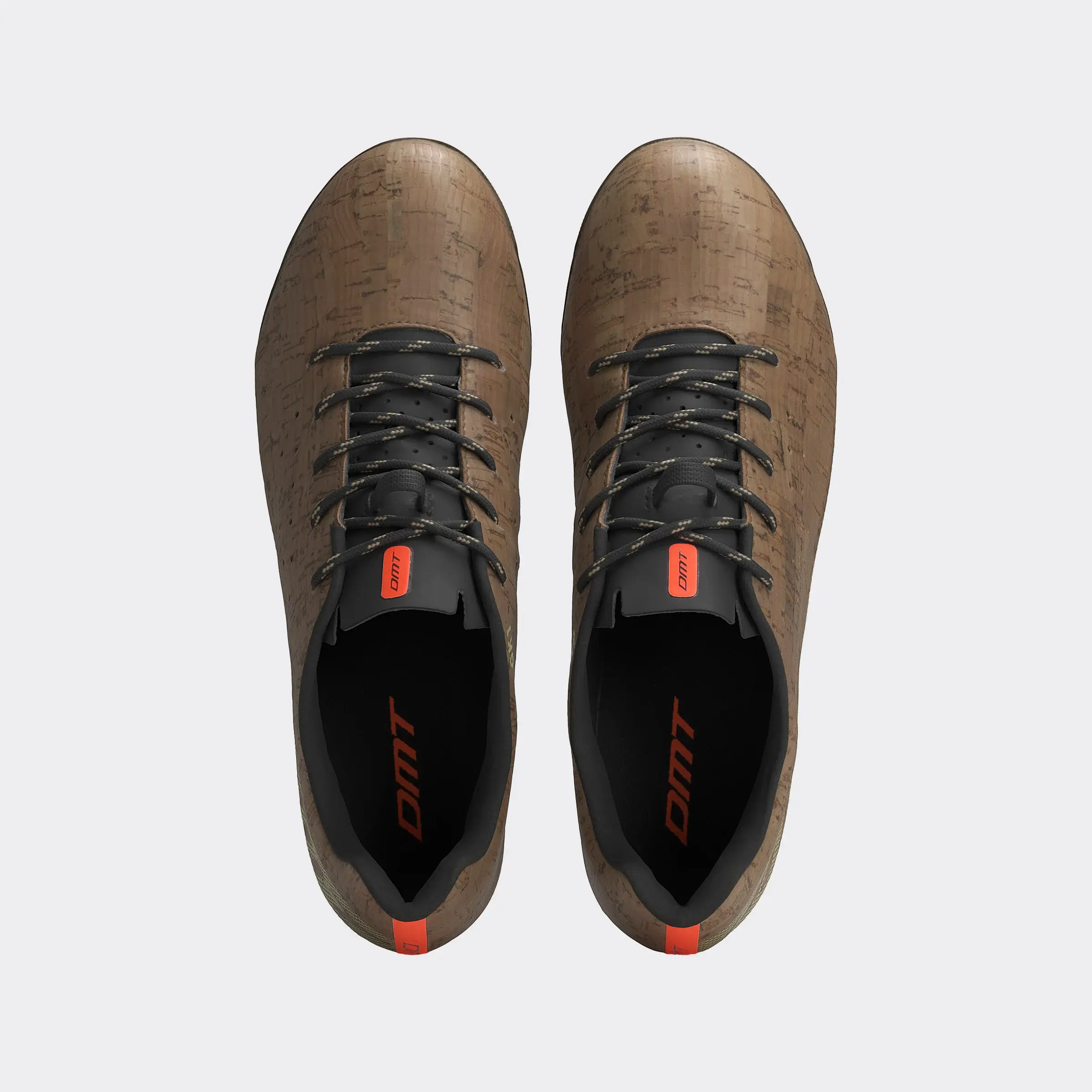 Deze DMT GK1 Gravelschoen is een zeer hoogwaardige gravelschoen. De schoen doet geen concessies aan pasvorm of comfort. Deze variant beschikt over een bovenwerk van natuurlijke kurk. Deze kurk is op ambachtelijke wijze geoogst en geeft de schoen een uniek patroon. De gaatjes in het bovenwerk geven de schoon maximaal ademend vermogen. De schoen heeft een vetersluiting, zodat de schoen perfect om jouw voet heen past. Daarnaast geven de veters de schoen een strak klassiek uiterlijk. De zool is gemaakt met Michelin rubber die je de flexibiliteit geeft om ook op zeer moeilijk begaanbaar terrein nog uit de voeten te kunnen.