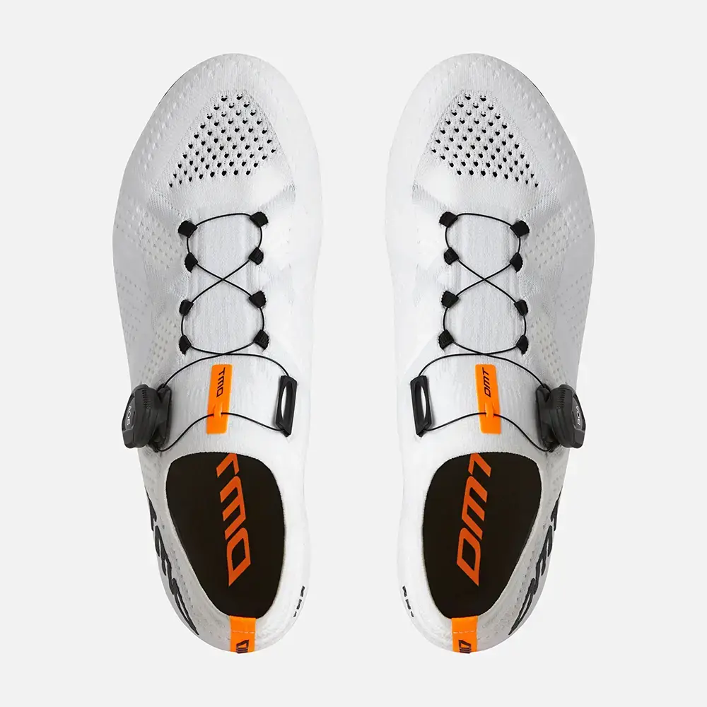 Deze DMT KR1 wielrenschoen is één van de topschoenen uit het assortiment van DMT. Deze hoogwaardige raceschoen doet eigenlijk geen concessies aan pasvorm of comfort. Het uit één stuk vervaardigde en naadloze gebreide bovenwerk zorgt voor een uitstekende ventilatie bij zware inspanning. De schoen heeft een BOA® Fit-systeem met een enkele IP1-draaiknop, zodat de schoen perfect om jouw voet heen past. De zool is gemaakt van een extreem lichtgewicht en stijf carbon. Dit maakt de schoenen uiteraard zeer licht, maar maakt ook de krachtoverbrenging naar de pedalen extreem goed. Voor een perfecte pasvorm en ongekende prestaties zijn deze schoenen ontwikkeld in samenwerking met Elia Viviani.
