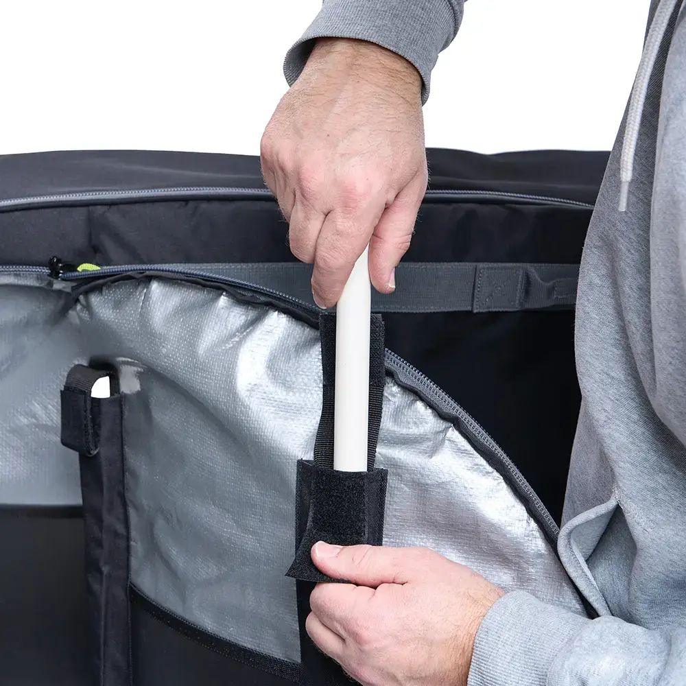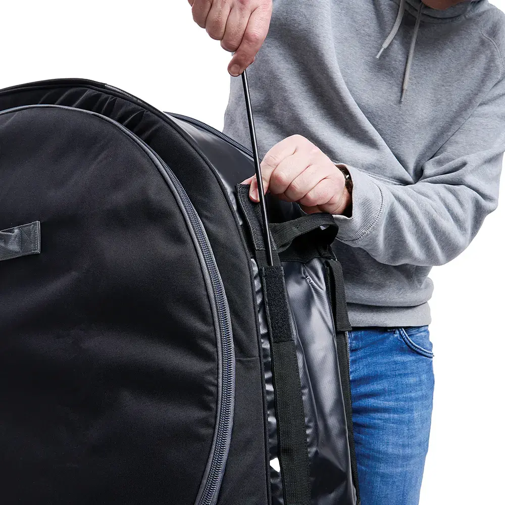 Om je fiets goed in de tas te kunnen stoppen moet deze eerst gedemonteerd worden. Zo moeten beide wielen en pedalen gedemonteerd worden en het stuur moet bij de stuurpen worden losgemaakt en verticaal worden bevestigd aan de meegeleverde framepad.