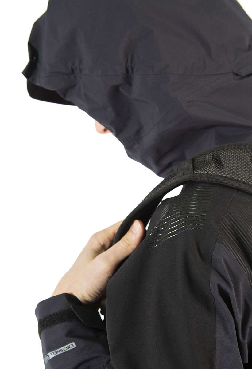 ExoShell40DR™Dit high-end materiaal is extreem waterdicht en heeft een immens groot ademend vermogen. Een waterkolom van 20.000mm zorgt ervoor dat er geen druppel binnen komt en een ademend vermogen van maar liefst 40.000g/m2/24hr houdt je extreem droog van binnenuit. Het geheim van de stof is het ultradunne (fluorine vrije) membraan dat 50% dunner is dan membranen met dezelfde eigenschappen. Hierdoor is de stof ook erg licht en compact op de bergen. Deze DR variant is voorzien van een extra stevige buitenlaag waardoor het beter bestand is tegen ruige omstandigheden. Het materiaal is afgewerkt met een milieuvriendelijke PFC vrije DWR coating waardoor het waterafstotend is.
