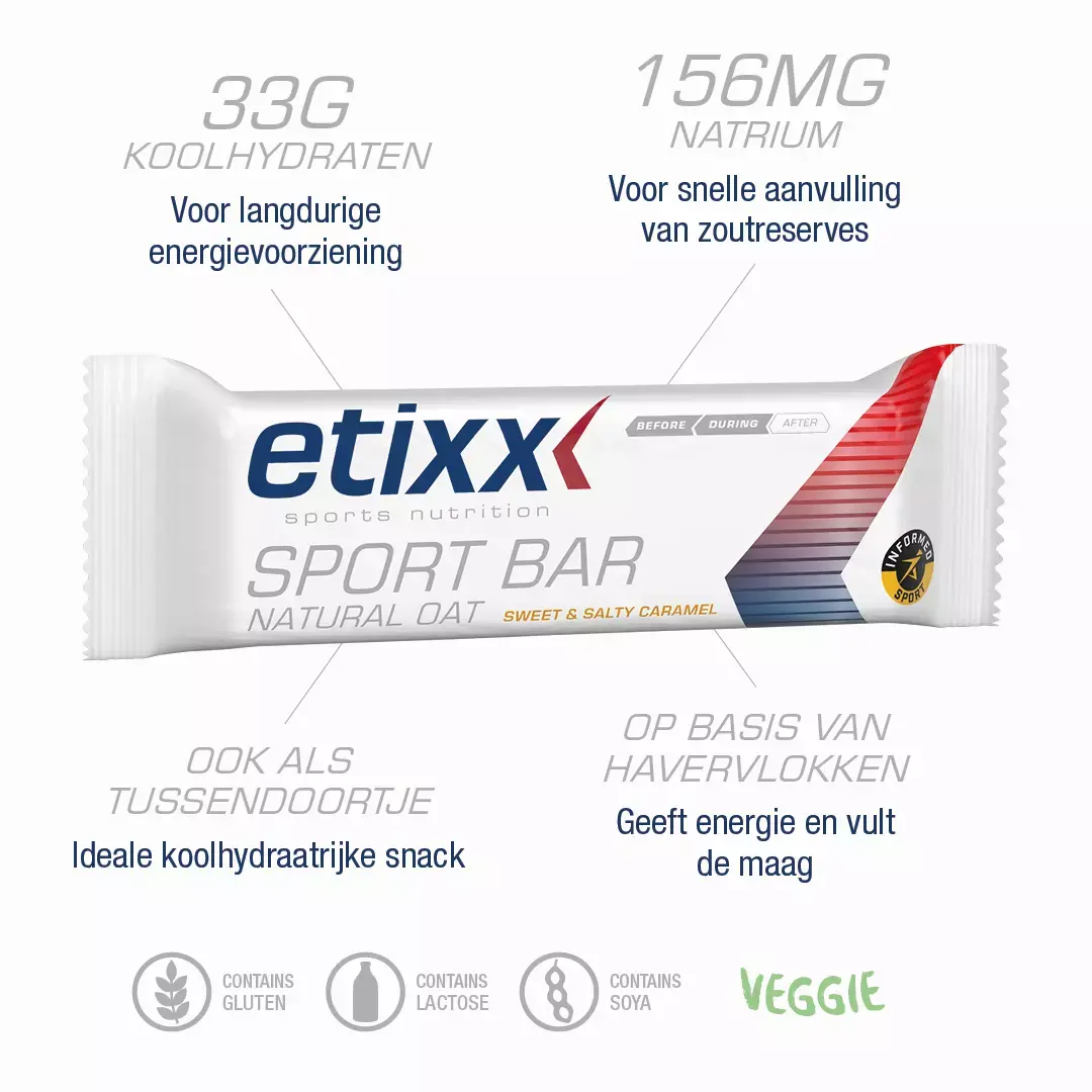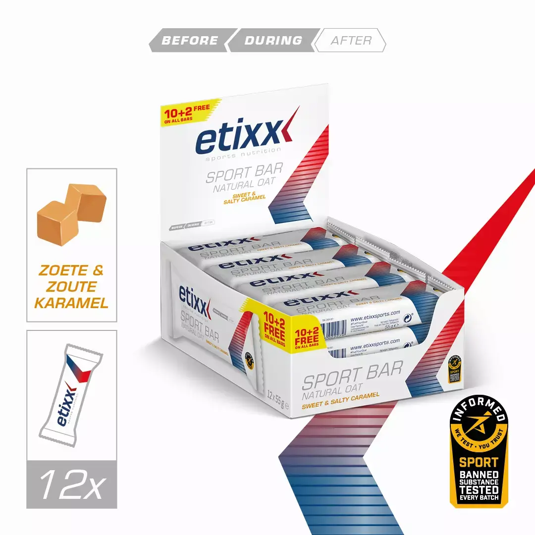 De Etixx Natural Oat Sportreep bevat vooral havervlokken (i.p.v. tarwe), wat zorgt voor een extra heerlijke crispy bite. De repen zijn ideaal voor duursporters die een hongergevoel willen voorkomen en altijd met een volle tank willen starten aan hun activiteit. De repen kunnen voorafgaand of aan het begin van een activiteit worden gegeten. De opname van koolhydraten verloopt namelijk trager dan bij de klassieke Energy Sport Bars door het hogere vetpercentage. Daardoor wordt de afgifte van energie over een lange periode verdeeld, zodat een hongergevoel tijdens het sporten wordt voorkomen. De repen hebben een lekkere zoete/zoute karamelsmaak.