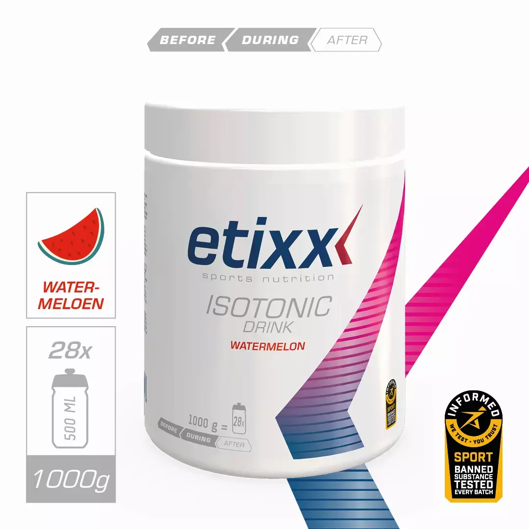 Deze Isotonic Sportdrank van Etixx heeft een frisse watermeloensmaak en wordt geleverd in een pot à 1000 gram. De isotone drank in poedervorm is eenvoudig te mengen met water en werkt uitstekend als dorstlesser. Het lichaam kan deze drank snel en gemakkelijk opnemen zodat je ook bij veelvuldig transpireren optimaal kunt blijven presteren. Dit product maakt deel uit van de Endurance-lijn van Etixx. De voedingssupplementen binnen deze lijn dragen bij aan het opbouwen en op peil houden van de conditie van de echte duursporter. De supplementen zitten boordevol zink, ijzer en koolhydraat-elektrolytoplossingen en vormen een goede aanvulling op je dagelijkse voeding.