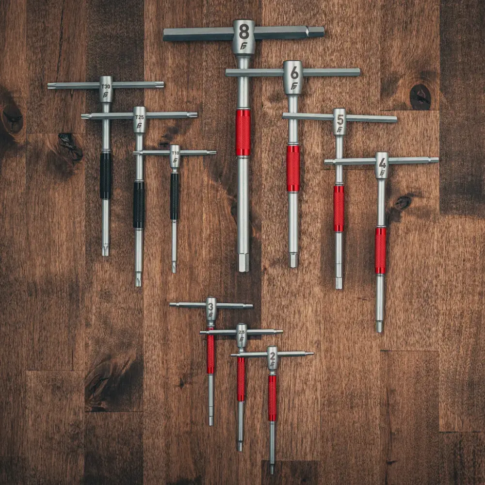 Modulaire T-HandgrepenHet unieke modulaire systeem van deze T-handgrepen geeft je ongekende vrijheid. De dwarsstangen kunnen niet alleen in drie posities worden geschoven om de perfecte hefboom te creëren, maar zijn ook volledig te verwijderen. Hierdoor kun je de sleutel als een 'pen' gebruiken voor extreem krappe ruimtes. Bovendien kun je de verschillende drivers en dwarsstangen onderling uitwisselen om je eigen ideale set-up samen te stellen voor elke specifieke onderhoudsklus.