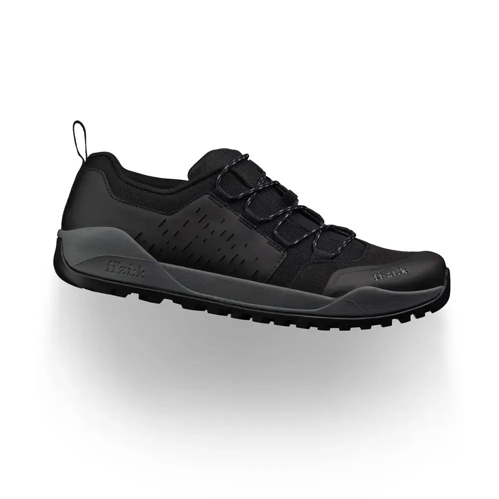 De Fizik Terra Ergolace X2 Flat Mountainbikeschoenen kunnen elk avontuur aan dankzij het robuuste ontwerp. De bovenzijde is gemaakt van sterk geweven Ripstop materiaal dat wel tegen een stootje kan en tevens zeer goed ademt. De pasvorm is nauwkeurig af te stellen dankzij het vetersysteem dat schuin op de schoen is aangebracht. Zo wordt voorkomen dat een losgeraakte veter tussen de kettingbladen van je MTB kan komen. De Terra Ergolace X2 e-bike zool biedt de perfecte balans tussen trap-efficiëntie en comfort, ideaal voor zowel fietsen als lopen. De EVA-tussenzool zorgt voor demping en stabiliteit, terwijl het Vibram-profiel uitstekende grip biedt in alle omstandigheden.
