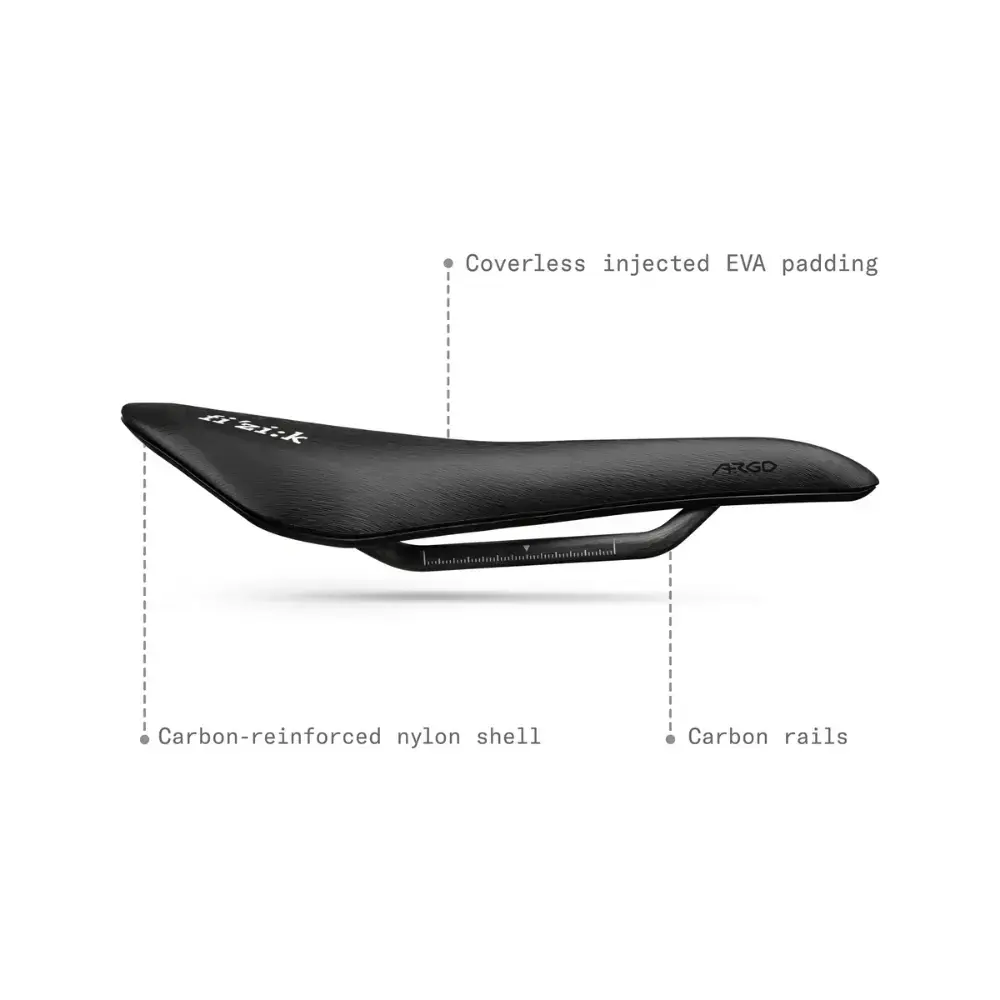 Het Fizik Vento Argo R1 Light zadel is een performance racezadel met een 'short-nose' ontwerp dat de stabiliteit verbetert en een agressievere, aerodynamische fietshouding mogelijk maakt. Als race-optie binnen de veelzijdige Argo-familie is dit zadel specifiek ontworpen voor moderne racefietsen met een agressieve geometrie. De doelgerichte vorm helpt je een betere fietshouding te bereiken; de verlaagde neus ondersteunt de schaamstreek wanneer het bekken naar voren kantelt om meer kracht te leveren of een meer aerodynamische positie aan te nemen. Waar een traditioneel zadel de rijder aanmoedigt vaak van positie te veranderen, plaatst de Argo de rijder in een vastere, meer stabiele positie. Dit zorgt voor een betere gewichtsverdeling. De korte lengte van de Vento Argo stelt je in staat om verder naar voren te zitten zonder onnodige druk uit te oefenen op gevoelige weefsels. Het zadel is voorzien van een ergonomische uitsparing, ontwikkeld op basis van gedetailleerde drukanalyse en medische input, wat zorgt voor een balans tussen comfort en competitieve prestaties, ideaal voor lange, snelle dagen in het zadel.