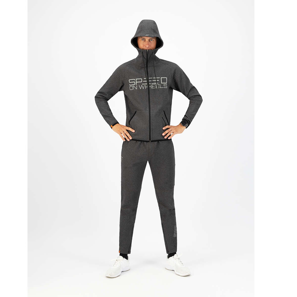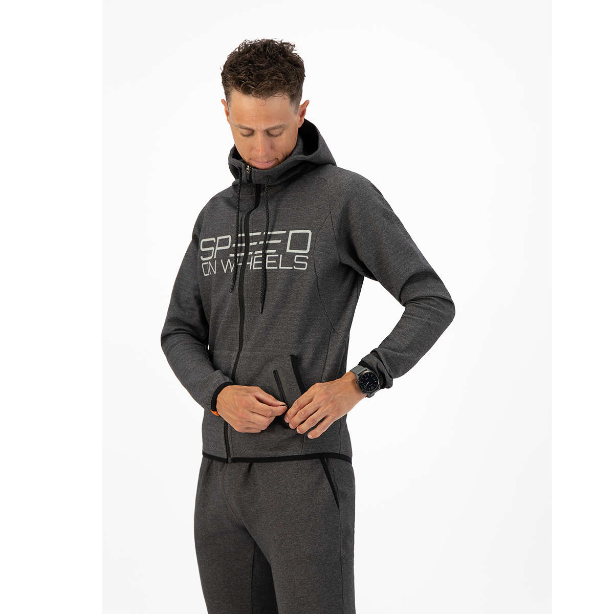 “De SPEED ON WHEELS Tech Hoodie is ontstaan uit mijn wens voor een hoodie die comfortabel genoeg is om in huis te dragen, maar die ook warmte en bescherming biedt als hij buiten gedragen wordt. De hoge kraag houdt de elementen buiten en de iets langere achterkant zorgt ervoor dat het jack ook goed zit als je op je fiets naar de start van je wedstrijd of cyclo rijdt. Op een van de zakken zit een handig vakje die je met de rits af kunt sluiten. Door de technische semi slim-fit pasvorm, loop je er stijlvol en sportief bij!