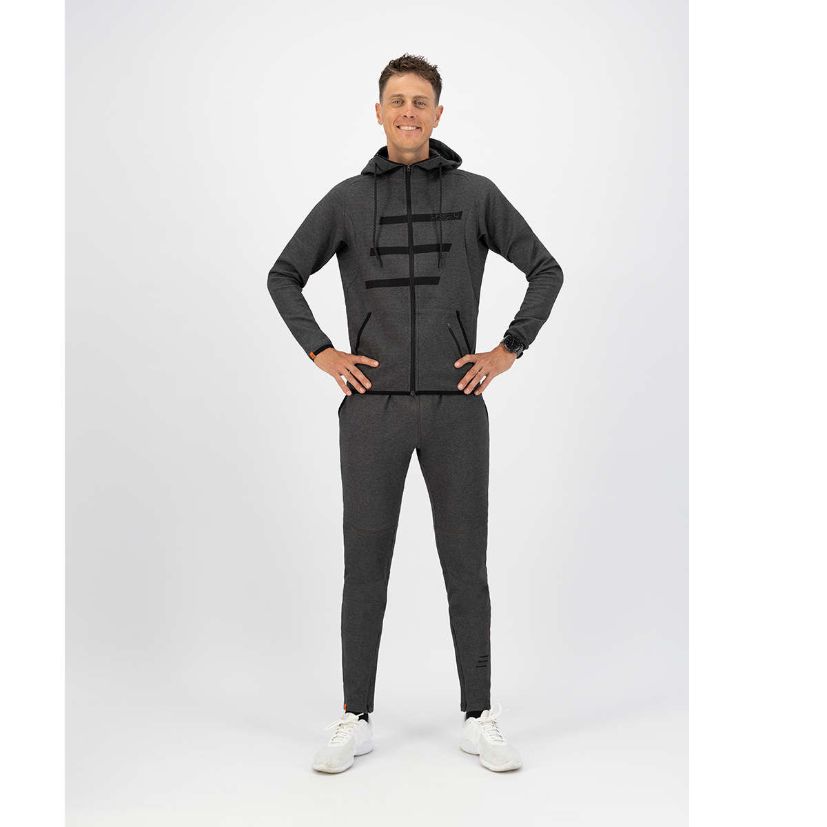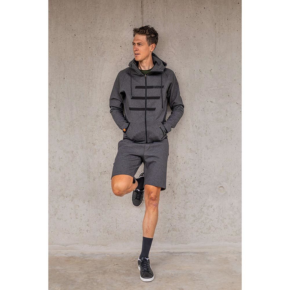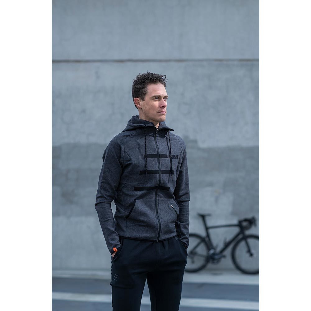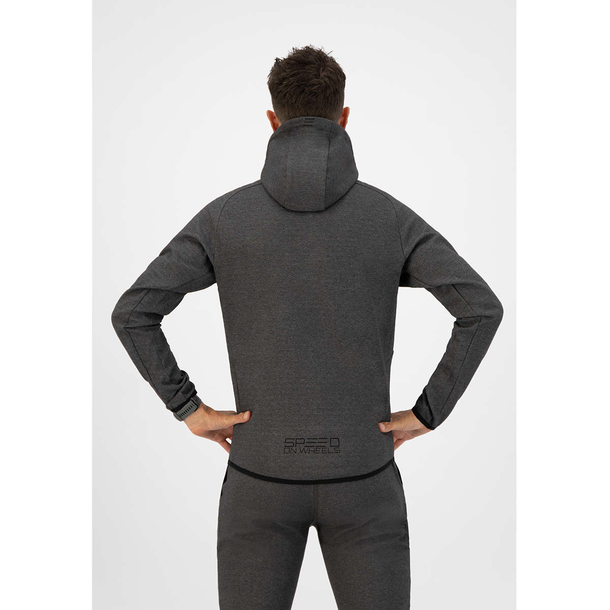 “De SPEED ON WHEELS Tech Hoodie is ontstaan uit mijn wens voor een hoodie die comfortabel genoeg is om in huis te dragen, maar die ook warmte en bescherming biedt als hij buiten gedragen wordt. De hoge kraag houdt de elementen buiten en de iets langere achterkant zorgt ervoor dat het jack ook goed zit als je op je fiets naar de start van je wedstrijd of cyclo rijdt. Op een van de zakken zit een handig vakje die je met de rits af kunt sluiten. Door de technische semi slim-fit pasvorm, loop je er stijlvol en sportief bij!