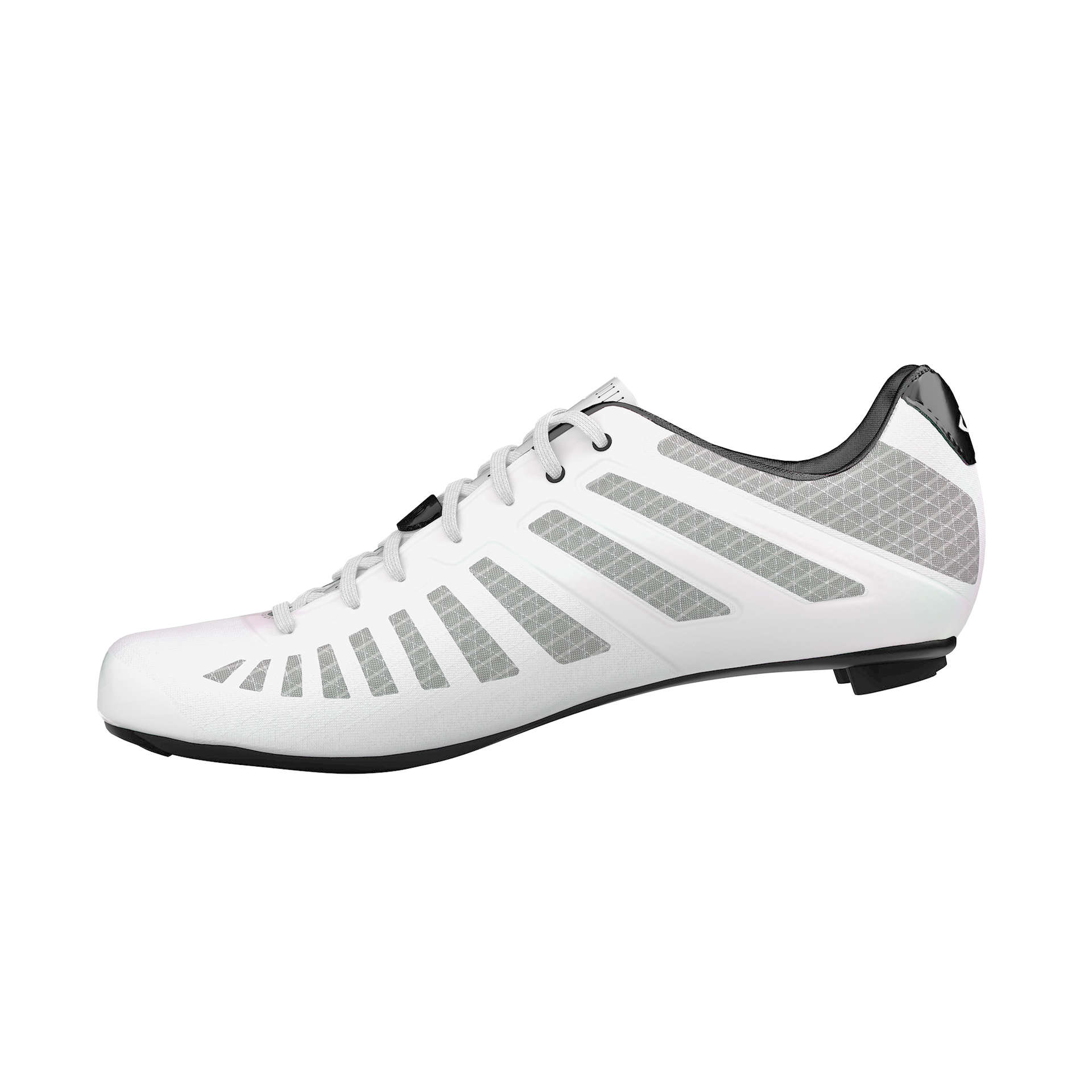 De Giro Empire SLX raceschoen zet met slechts 175 g gewicht een nieuwe standaard voor lichtgewicht fietsschoenen zonder daarbij concessies te maken bij krachtoverdracht, stijfheid en comfort. De veters lijken ouderwets, maar bieden werkelijk een fantastische pasvorm. De uit een stuk gesneden schoen van Evofiber™ SL microvezel met Easton® EC90 SLX2 zit als gegoten en brengt elke watt energie rechtsreeks over naar de pedalen.