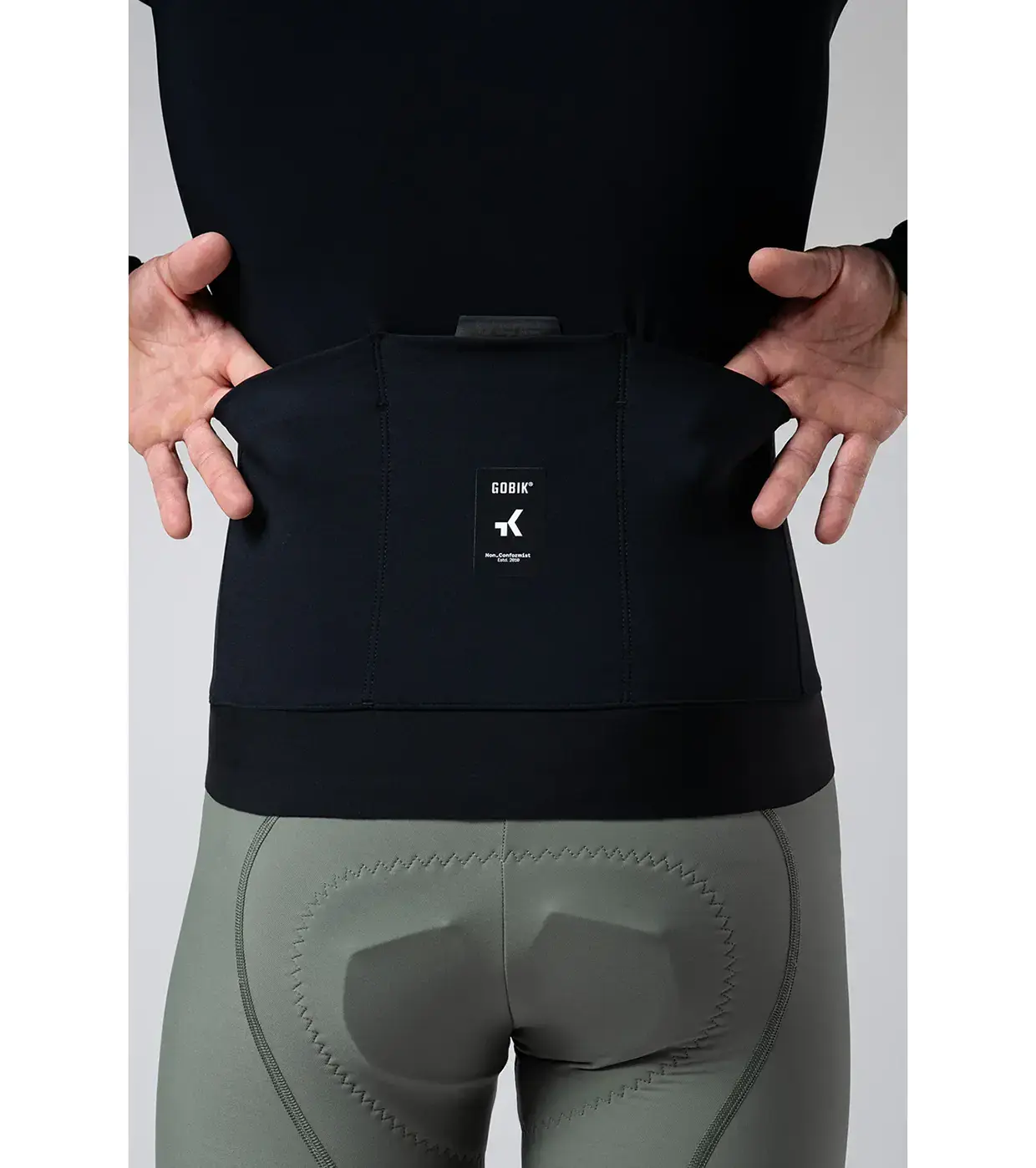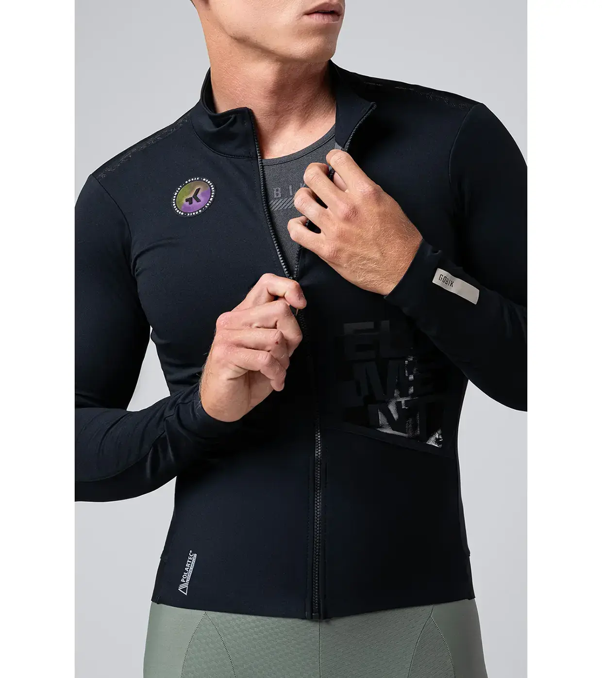 Het Gobik Element fietsjack is voorzien van Polartec Powershield Pro membraan: zeer goed ademend en toch waterdicht. Dit membraan is aangebracht op de mouwen en bovenzijde van de torso. Zo wordt je op de meest cruciale plekken beschermt maar blijft het jack licht en elastisch. Perfect voor de zeer fanatieke fietsers die de perfecte combi tussen aerodynamica en bescherming zoeken. De naden op de schouders zijn gesealed en de stof drijft vocht zeer snel af en ademt uitstekend.. De achterzakken zijn gemakkelijk bereikbaar, ook als je echt vermoeid bent. Rondom de taille op de achterzijde zit een binnenzak om je kleine accessoires in mee te nemen. De elastische tailleband houdt het jack perfect op z’n plek.