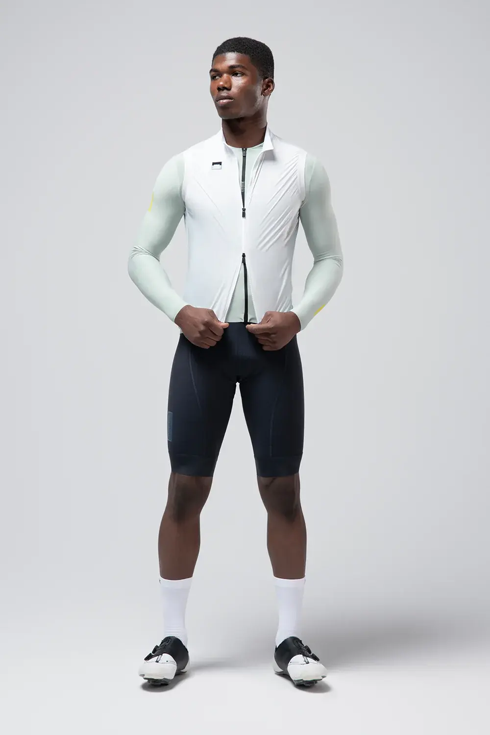 Dit vest sluit nauw aan en laat geen wind door. Het is gemaakt van een fijne stof die goed aanvoelt. Bovendien lichtgewicht en makkelijk mee te nemen voor indien nodig. Enige minpuntje werd al eerder benoemd: de kraag zit vrij hoog als je de rits helemaal dicht doet (wel zo aero) en dat kan benauwend zijn.