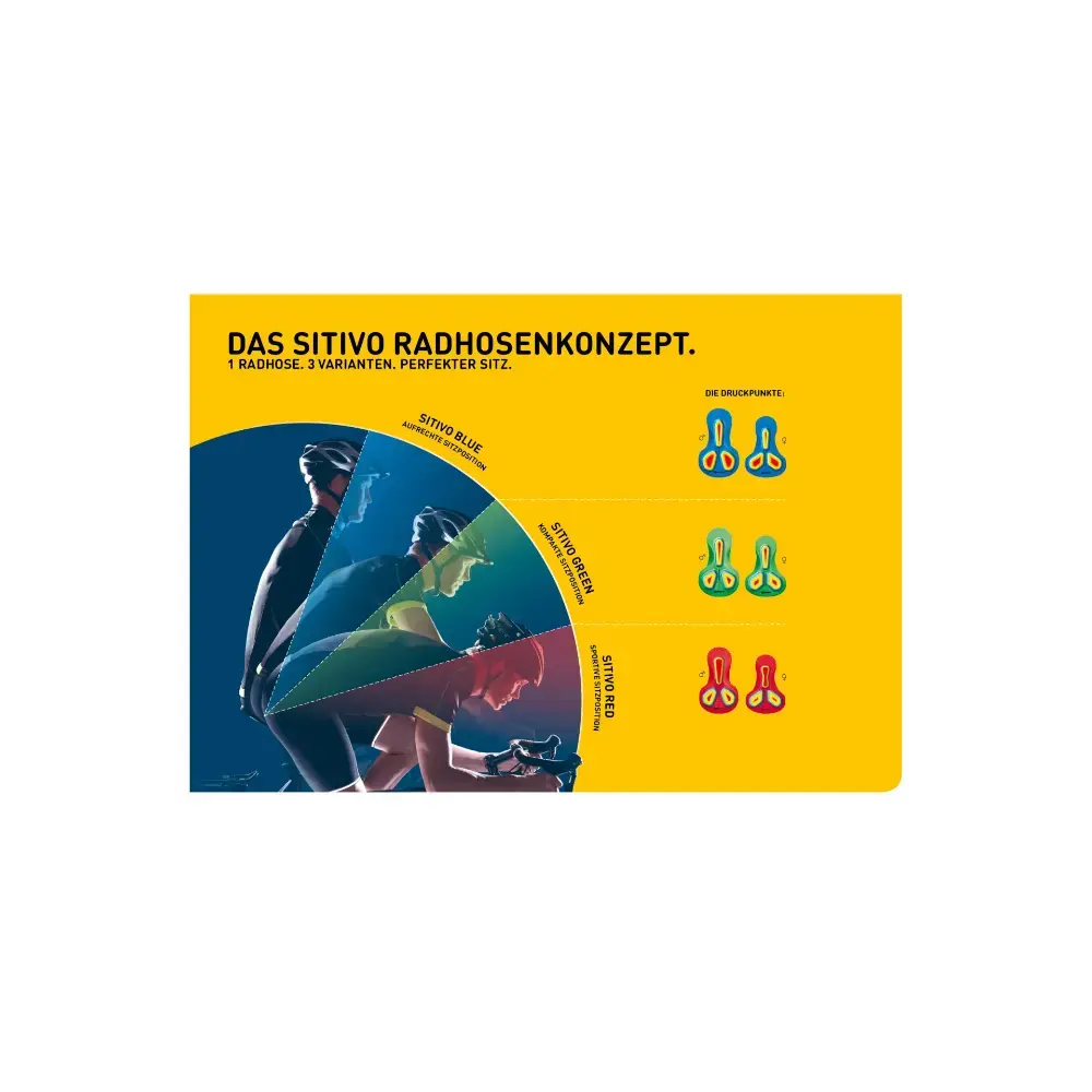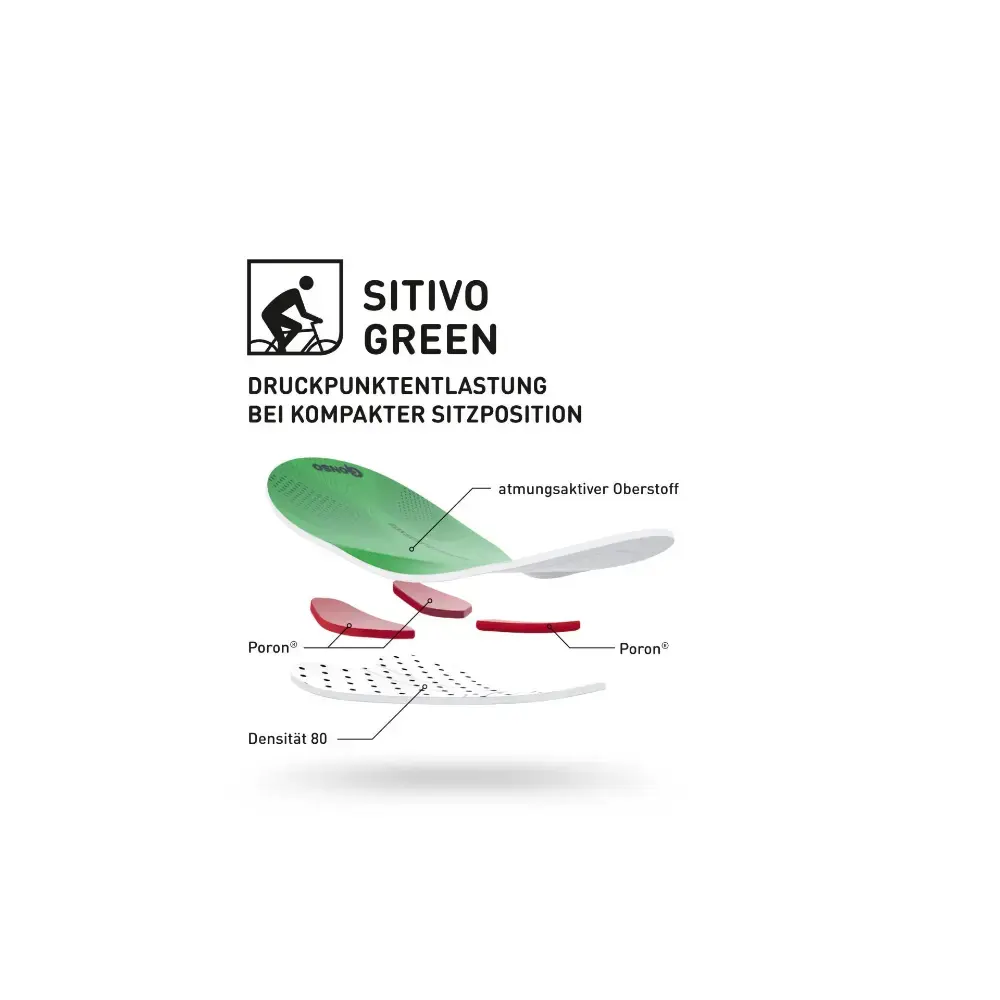 Sitivo zeem: Groen De groene Sitivo zeem is het meest geschikt voor echte toerfietsers die een licht voorovergebogen zitpositie hanteren. Het heeft de middel dunne zeem (16 mm) met een gemiddelde stevigheid. Met op drie plekken extra inlegstukken voor meer comfort. In deze zitpositie wordt er namelijk op deze drie punten druk uitgeoefend op het zitvlak.