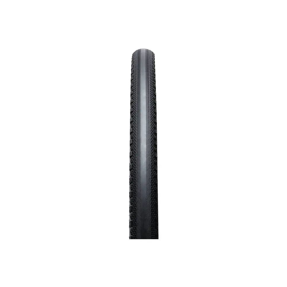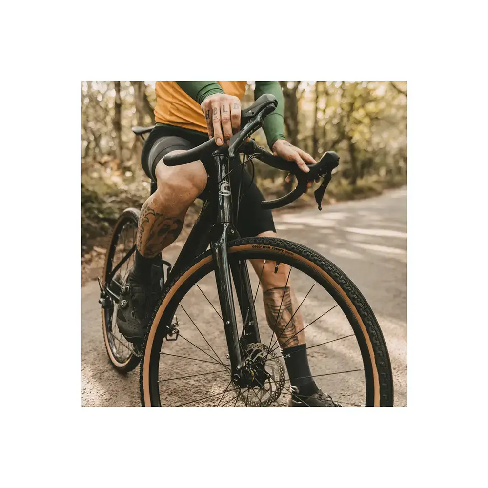 De County Ultimate Tubeless Complete Gravel Vouwband is een band met 2 gezichten, voor gebruik op los terrein en de verharde weg. De wijd uit elkaar geplaatste noppen aan de zijkant bieden vertrouwen op gravel- en zandwegen. Het gladde middenprofiel helpt je snelheid te ontwikkelen en behouden op het asfalt. De Goodyear R:Wall sidewalls en de Tubeless Complete constructie zorgen voor optimale duurzaamheid en minder lekker banden. Een multi-compound materiaallaag is toegevoegd aan het karkas van deze Tubeless Complete band. Die laag houdt de lucht beter vast en biedt tegelijkertijd lek- en snijbescherming. Het Dynamic:Silica4 compound is samengesteld om de rolweerstand te minimaliseren en de grip op nat wegdek te verbeteren. Door het unieke Tubeless Complete ontwerp blijft er na installatie meer kit achter waardoor je altijd klaar bent voor je volgende rit. De R:Shield beschermingslaag onder het loopoppervlak geeft nog eens extra lekbescherming. De fijne draadstof zorgt voor soepel en snel rollen en goede tractie en maakte het mogelijk een 120 TPI karkas met minder rubber te ontwikkelen.