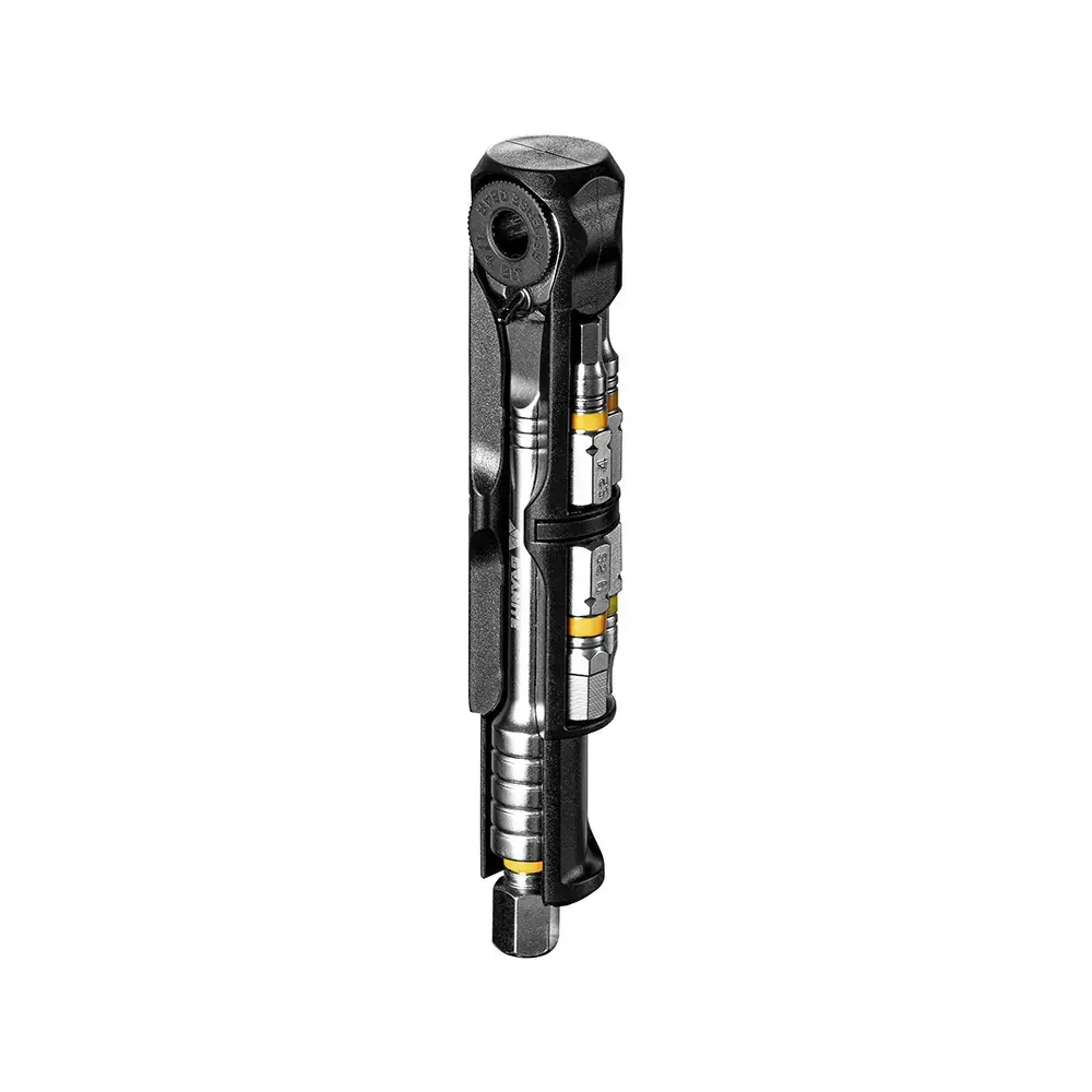 De Granite Design Stash RT Ratchet Tool Kit is de meest unieke oplossing om gereedschap mee te nemen op je MTB! Deze tool bevestig je namelijk dankzij het extreme design in je stuurbuis! Zo heb je ze niet alleen altijd bij je, maar zijn ze ook volledig uit het zicht weggewerkt. De sleutel wordt geleverd met 9 supersterke bits. Een geïntegreerde magneet houdt de gereedschapsbits op hun plaats. In het filmpje tussen de afbeeldingen kan je precies zien hoe de tool bevestigt wordt.