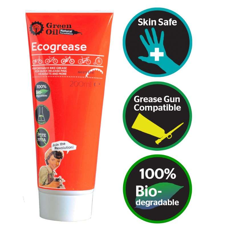 De Green Oil Ecogrease Lagervet is ideaal om draaiende onderdelen op je fiets weer soepel te laten lopen. Het vet is biologisch afbreekbaar en bevat alleen natuurlijke ingrediënten. Bovendien is de fles gemaakt van 100% gerecycled plastic. Het middel is vrij van Teflon, PTFE en petrochemicaliën, dus het is veilig voor je huid als het op je handen komt. Zo zorg je goed voor jezelf en voor het milieu! En voor je fiets natuurlijk.