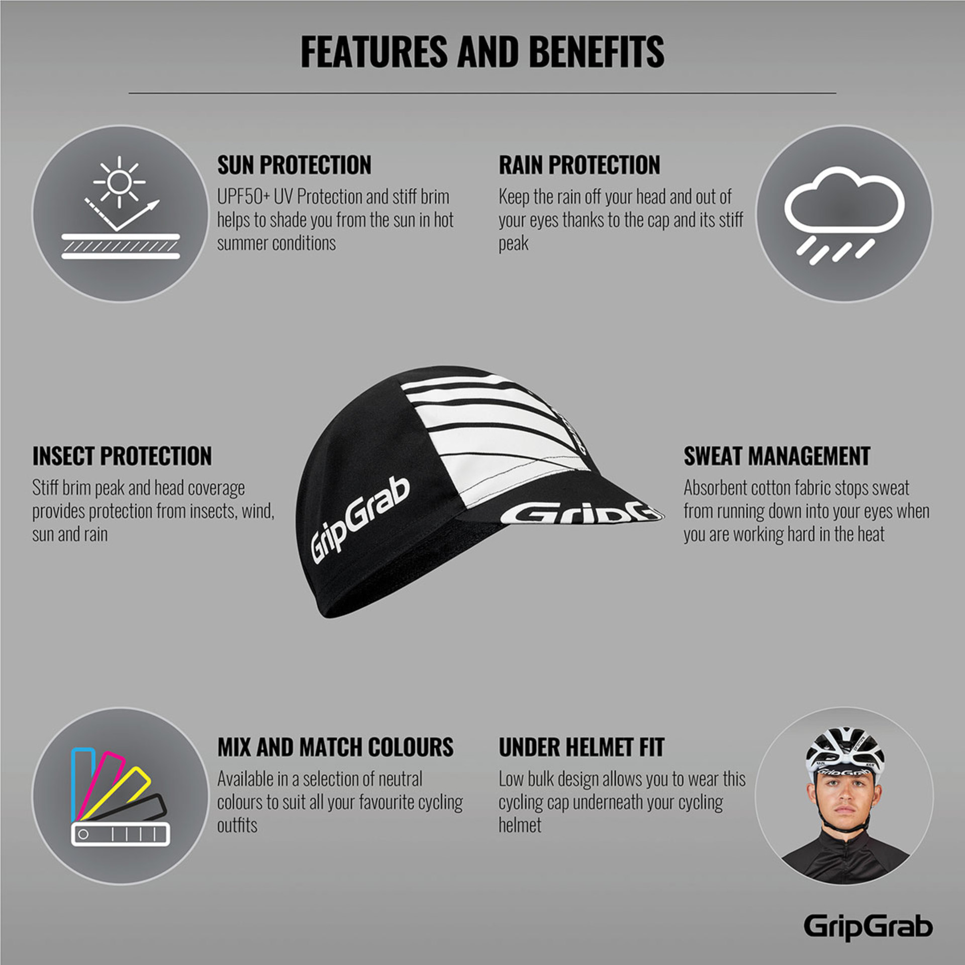 De GripGrab Cycling Koerspet heeft een klassiek design, met een sterke grafische stijl die de GripGrab passie voor de wielersport benadrukt. Deze koerspet kan zowel onder helm gedragen worden als na de race.