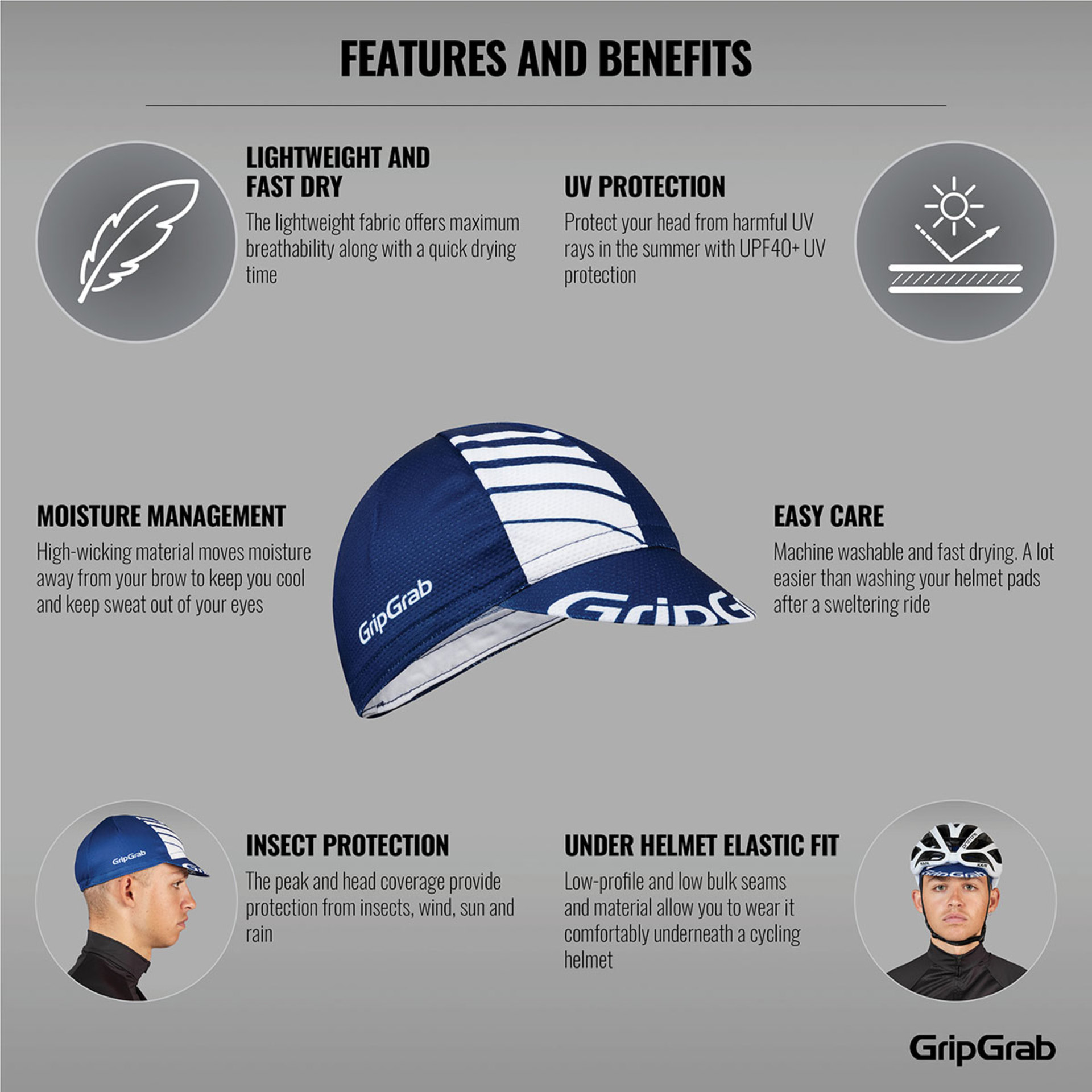De GripGrab Lightweight Summer Koerspet beschermt je tegen zon maar ook tegen opspattend vuil. Deze koerspet sluit erg mooi op je hoofd aan dankzij het elastische gedeelte aan de achterzijde. De pet heeft een goed ademend vermogen en zorgt ervoor dat je hoofd koel en droog blijft. Ook beschermt de pet je tegen schadelijke UV Straling.
