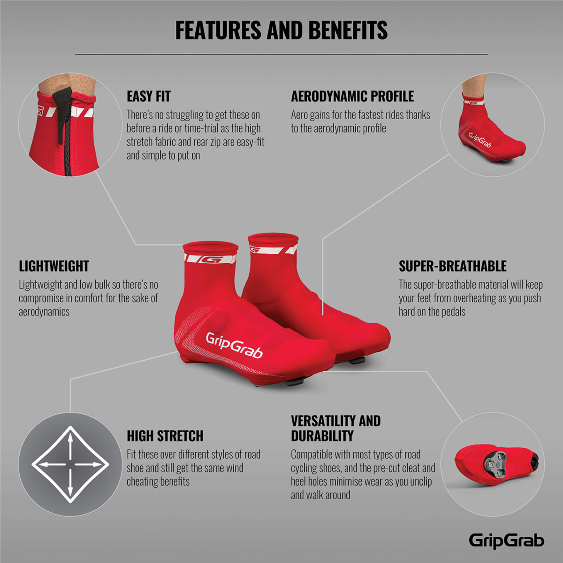 De GripGrab RaceAero Overschoenen zijn speciaal ontwikkeld om te gebruiken op de racefiets. De schoenen zijn zeer aerodynamisch en hebben een goed ademend vermogen. Dankzij de lycra die is toegepast bij deze overschoen zijn ze super elastisch. Deze overschoen is daarom ook geschikt voor schoenmaat 38 tot en met schoenmaat 46. De overschoen is eenvoudig aan en uit te trekken dankzij de ritssluiting die op de achterzijde zit. Deze ritssluiting wordt aan de bovenzijde afgeschermd met ritsgarage.