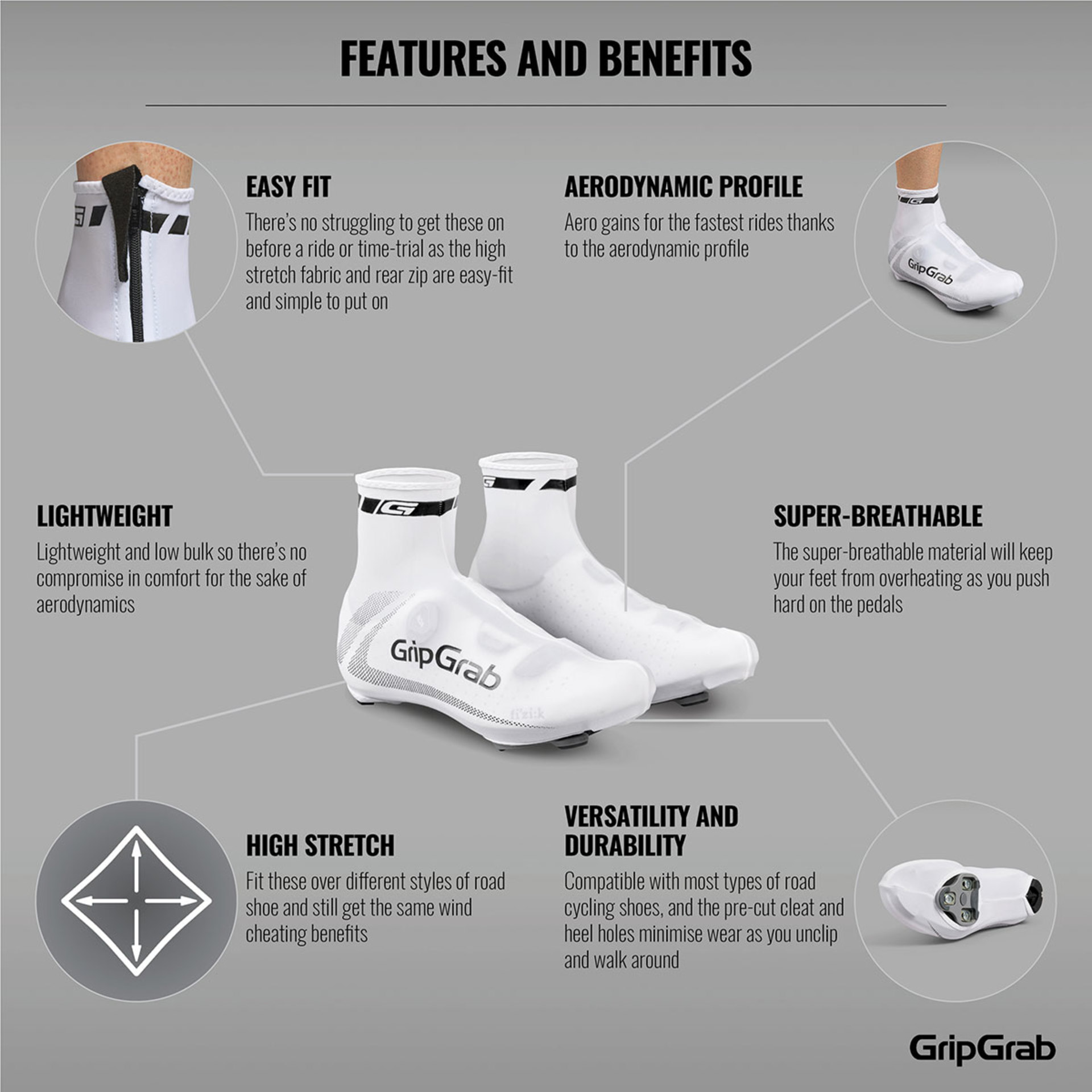 De GripGrab RaceAero Overschoenen zijn speciaal ontwikkeld om te gebruiken op de racefiets. De schoenen zijn zeer aerodynamisch en hebben een goed ademend vermogen. Dankzij de lycra die is toegepast bij deze overschoen zijn ze super elastisch. Deze overschoen is daarom ook geschikt voor schoenmaat 38 tot en met schoenmaat 46. De overschoen is eenvoudig aan en uit te trekken dankzij de ritssluiting die op de achterzijde zit. Deze ritssluiting wordt aan de bovenzijde afgeschermd met ritsgarage.
