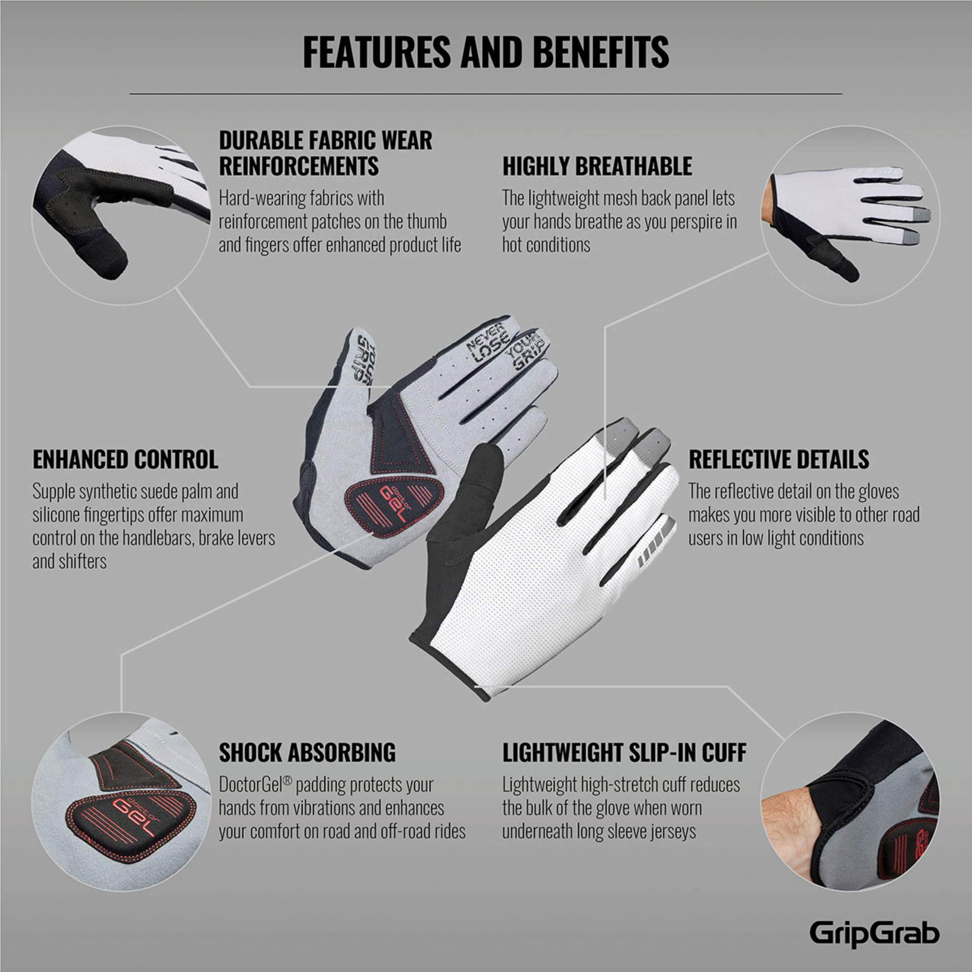• DoctorGel 4 mm kussentjes in de handschoenen geven goede balans tussen comfort en controle