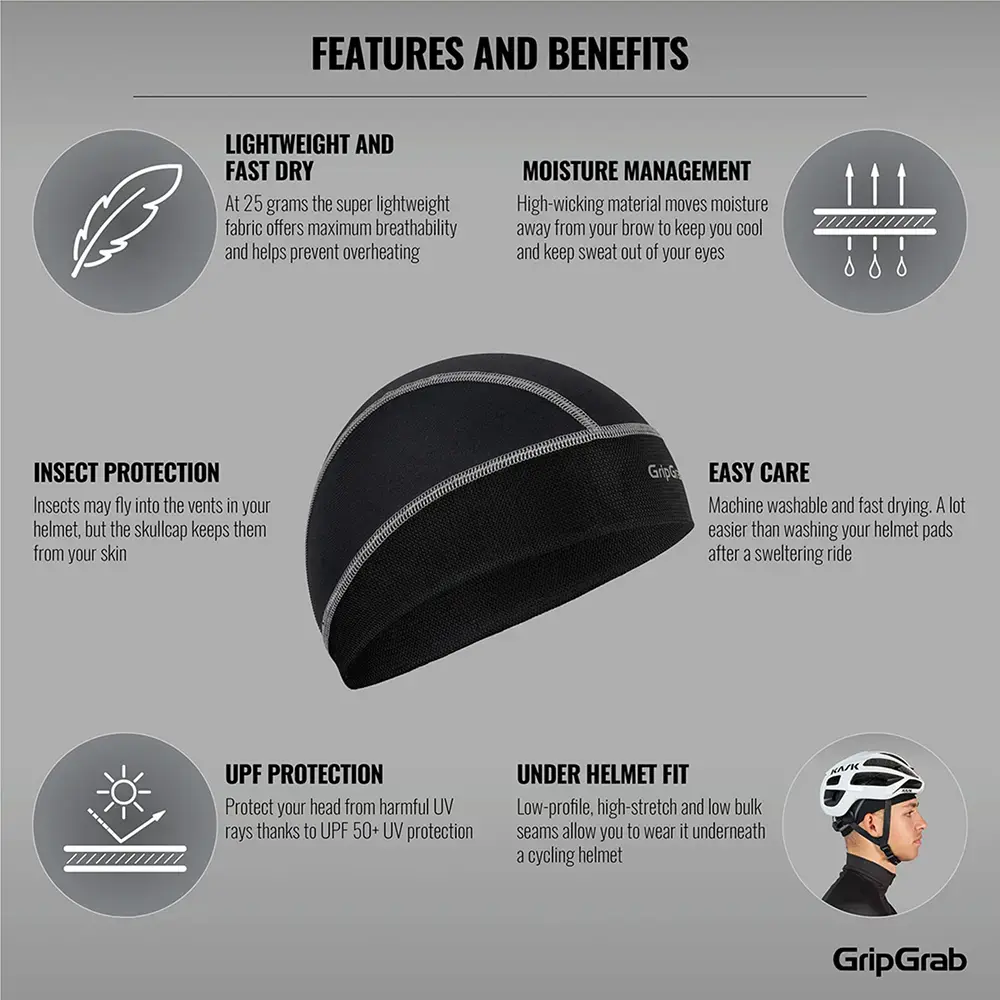 De GripGrab Skull Cap is zeer zacht, licht van gewicht en ademend. Hij biedt een goede bescherming tegen de zon, voert transpiratie snel af en sluit perfect aan zodat hij ook in combinatie met een helm gebruikt kan worden. De binnenzijde is gemaakt van zacht geborsteld materiaal dat comfortabel aanvoelt.