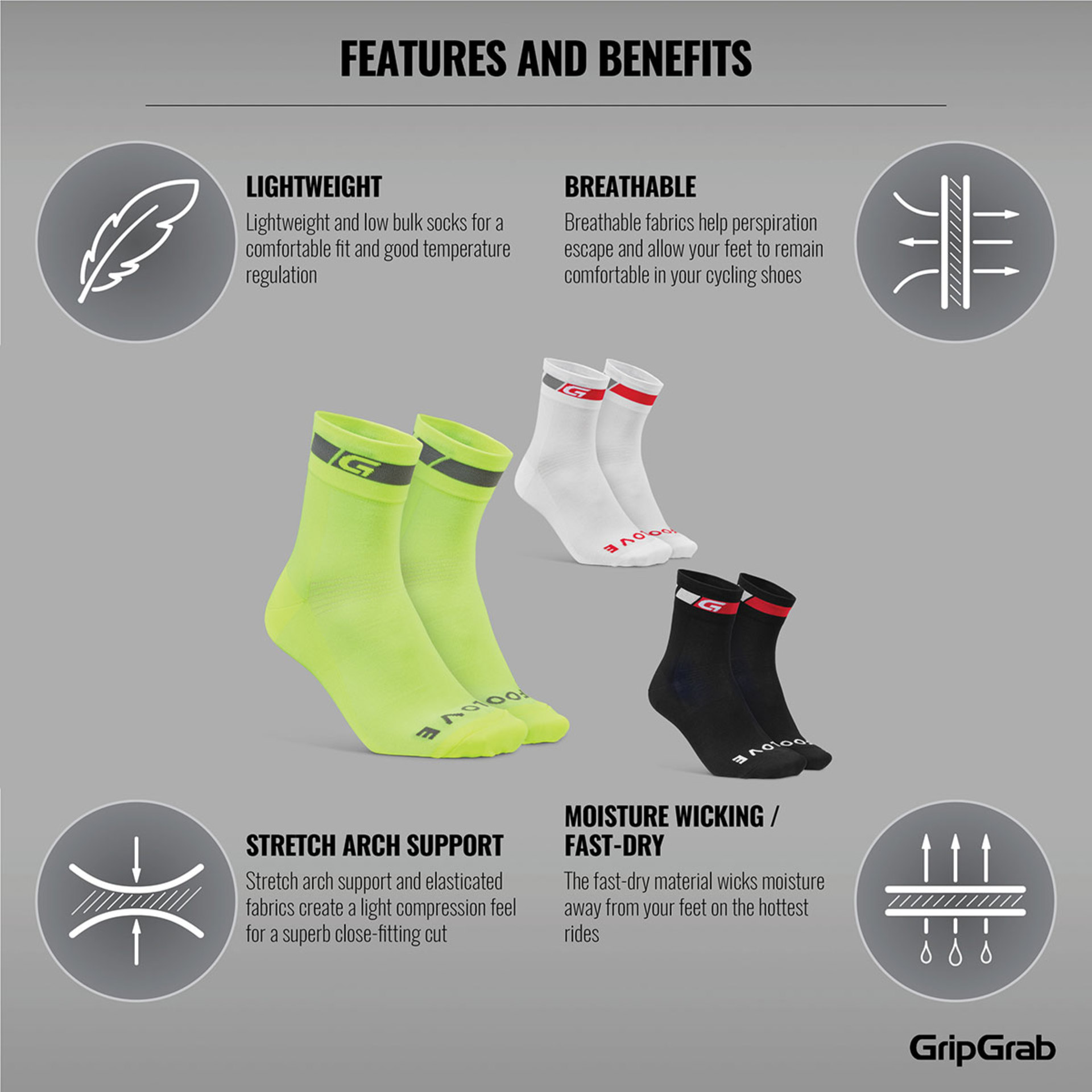 Met de GripGrab Tricolore Regular Cut Sokken heb je altijd wel een geschikt paar fietssokken. Dit 3-pack bestaat uit een zwart, wit en een Hi-Vis geel paar. De sokken hebben een goed ademend vermogen en reguleren vocht erg goed. Zo blijven je voeten comfortabel en droog aanvoelen.