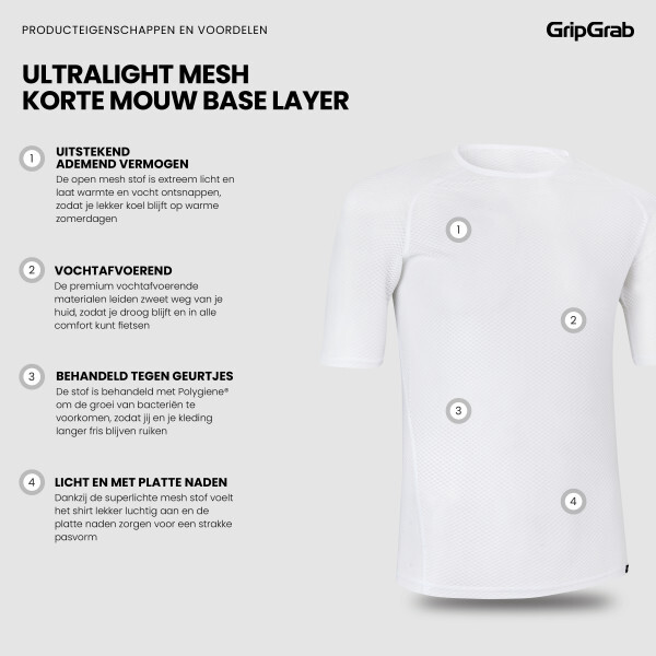 Het GripGrab Ultralight Mesh is een zeer comfortabel ondershirt voor heren en dames. De geweven wesh-structuur maakt het ademende vermogen van dit shirt optimaal. Dit maakt hem zeer geschikt voor de warmere dagen van het jaar. Dankzij de ergonomische pasvorm en het minimaal aantal naden zit dit shirt je als gegoten! Hij beweegt dankzij de ideale hoeveelheid elastaan dat is gebruikt perfect mee met je lichaam, welke houding je ook aanneemt. Het shirt heeft polygiene behandeling ondergaan waardoor het antibacteriële eigenschappen heeft. Dit voorkomt nare geurtjes en je hoeft het niet na iedere rit te wassen. Super duurzaam dus!