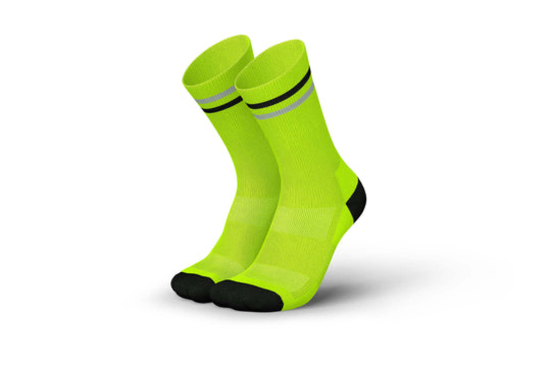 De Incylence V1 Hiviz sokken profiteer je van onovertroffen ademend vermogen in unieke fiets- en hardloopsokken. De opvallende kleur maakt je goed zichtbaar, ook in donkere omstandigheden. Dit wordt versterk door de reflecterende strepen en het logo. De brede, dubbellaagse tailleband voorkomt dat zweet in je schoenen loopt doordat het vocht optimaal geabsorbeerd wordt. Daarnaast is een dubbele band extra comfortabel en zakt het niet naar beneden. De mesh structuur in het weefsel zorgt voor maximale ventilatie. In het gebied van de achillespees en hiel is extra demping aangebracht voor maximaal comfort.