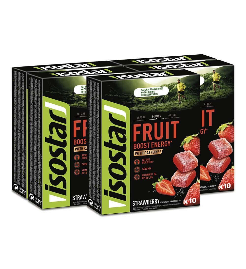 Deze Fruit Boost Strawberry zijn evenwichtig samengestelde koolhydraatrijke snacks om tijdens je intensieve activiteit te gebruiken. Deze snoepjes ondersteunen je energiereserves en zorgen voor een normaal spier functioneren zonder kramp. Verder bevatten ze ook 10 gram cafeïne wat zorgt voor een boost en extra alertheid.