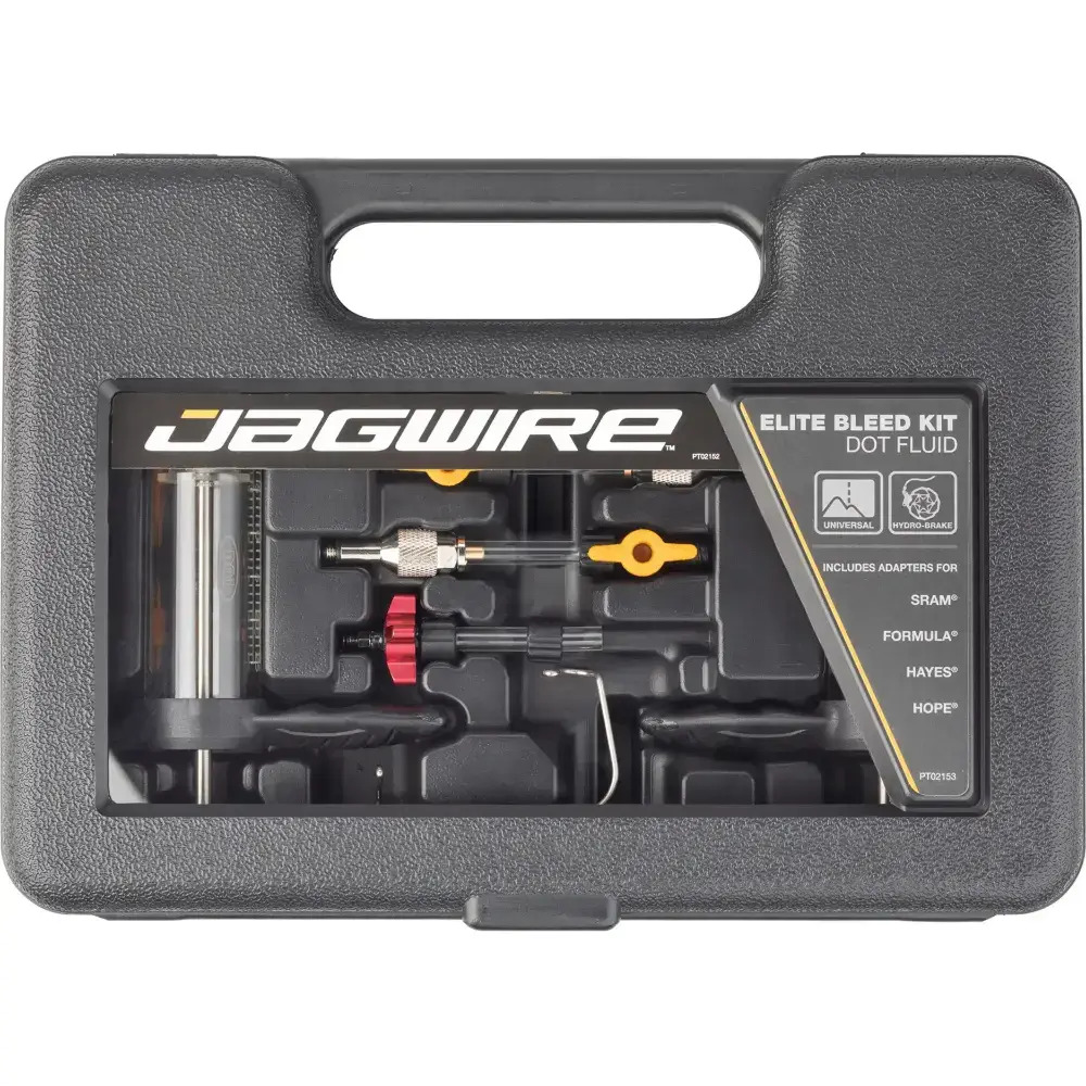 Deze professionele Jagwire Elite DOT Bleed Kit is een ontluchtingsset voor de serieuze thuismechanieker of werkplaats die werkt met DOT-vloeistof hydraulische remsystemen. De zeer complete kit bevat alles wat je nodig hebt om remmen van onder andere SRAM, Avid, Formula, Hayes en Hope perfect en lekvrij te ontluchten. De premium spuiten en innovatieve ventielen maken het werk eenvoudiger en schoner. Geleverd in een luxe, stevige koffer die alle onderdelen georganiseerd en beschermd houdt.