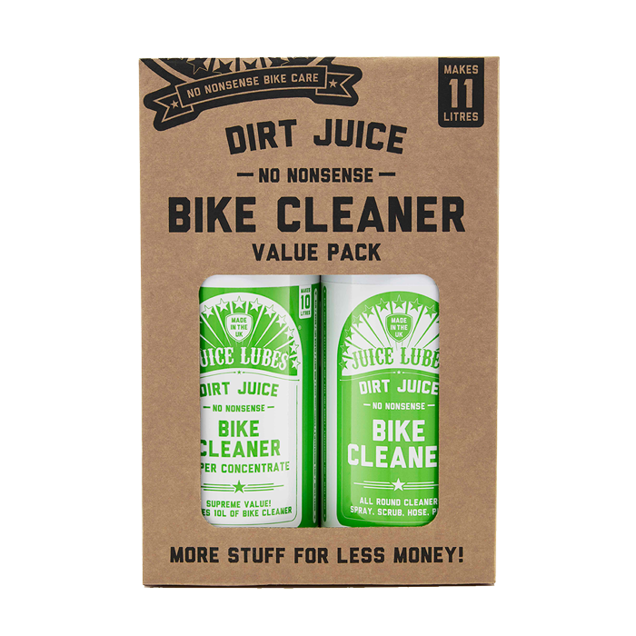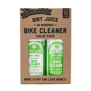 Het Dirt Juice Double Pack bevat twee artikelen van Juice Lubes in één pakket: de Dirt Juice Bike Wash met een sproeiknop en de Dirt Juice Super Concentrate. De Super Concentrate is de onverdunde, geconcentreerde reiniger. Het is een slimme, krachtige ontvetter die perfect is voor het wassen van vuile fietsen en onderdelen zoals cassettes en kettingen. Voeg water toe en Dirt Juice Super verandert in Dirt Juice Bike Wash, een spijkerharde, eenvoudige en voordelige bike wash die vriendelijk is voor verf maar taai tegen vuil. Als het gemengd is met water, zal het maar liefst 11 liter wasmiddel voor de fiets opleveren. Bijkomend voordeel: je kunt de flessen zo vaak hergebruiken als je wil. Als je klaar bent zijn ze volledig recyclebaar.