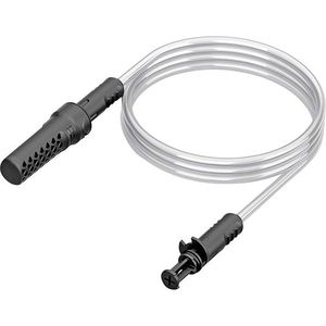 Hiervoor wordt de tank van de drukreiniger verwijderd waarna het aansluitstuk van de slang wordt bevestigd op het aansluitpunt. Het andere einde van de slang met filter wordt in het water gelegd. Zodra het pistool wordt ingeschakeld, zuigt de drukreiniger het water aan. Het filter voorkomt dat er vuil water in het apparaat komt. Het filter kan eenvoudig worden schoongemaakt door het te verwijderen en uit te spoelen onder stromend water. Met een lengte van 2 meter heeft de aanzuigslang een grote actieradius.