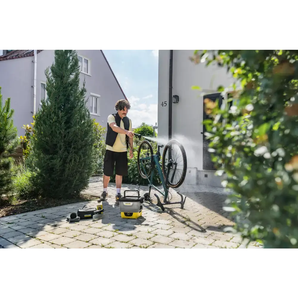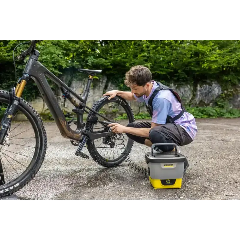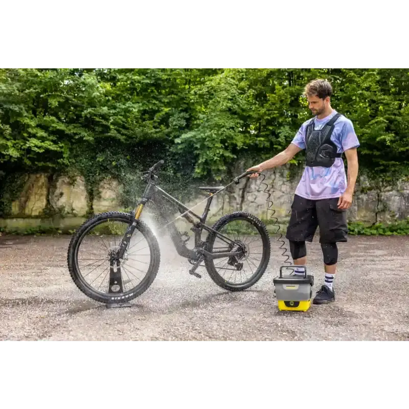 De Kärcher Mobile Outdoor Cleaner OC 4 + Bike Kit is de ideale mobiele reinigingsoplossing voor fietsers en outdoorliefhebbers. Dankzij de geïntegreerde lithium-ionaccu en de 8-liter watertank ben je niet afhankelijk van stroom- of wateraansluitingen. De Kärcher-sproeitechnologie biedt een zachte maar effectieve reiniging, ideaal voor fietsen en andere gevoelige oppervlakken. De meegeleverde Bike Kit bevat een universele borstel, een microvezeldoek en een Multi Jet 4-in-1 sproeier, waardoor je jouw fiets optimaal kunt reinigen zonder schade aan lagers of afdichtingen te veroorzaken. Bovendien zorgt het slimme opbergconcept ervoor dat het apparaat en de accessoires volledig in de lege watertank kunnen worden opgeborgen, wat ruimte bespaart tijdens transport en opslag.