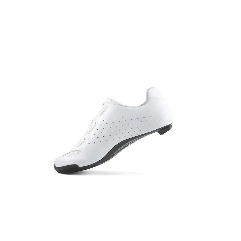 Deze Lake CX238 Wide Wielrenschoenen zijn zeer hoogwaardige schoenen voor zeer gedreven wielrenners. Deze schoen is bedoeld voor fietsers me brede tot extra brede voeten. Door de zeer stijve carbon zool wordt al je kracht direct op de pedalen gebracht. Het slanke ontwerp sluit nauw om je voeten aan om beweging in de schoen tot een minimum te beperken, maar biedt wel voldoende ruimte om afknelling te voorkomen tijdens stukken waar je even moet rennen in een wedstrijd. Als aanvulling beschikken de schoenen over twee BOA sluitingen welke zeer precies af te stellen zijn. Hierdoor zal je altijd de perfecte pasvorm vinden. Om te zorgen dat je geen té warme voeten krijgt, zijn er perforaties in het bovenwerk aangebracht en extra mesh stukken toegevoegd. Daarnaast helpt de voering met het snel afvoeren van hitte en vocht. Het bovenwerk is gemaakt van slijtvast en waterafstotend leder met extra Aramide stukken op de meest blootgestelde delen zoals de hiel. De rubberen onderzool biedt veel grip in modderige omstandigheden, ideaal tijdens een wedstrijd waarbij je ook af en toe van de fiets af moet.