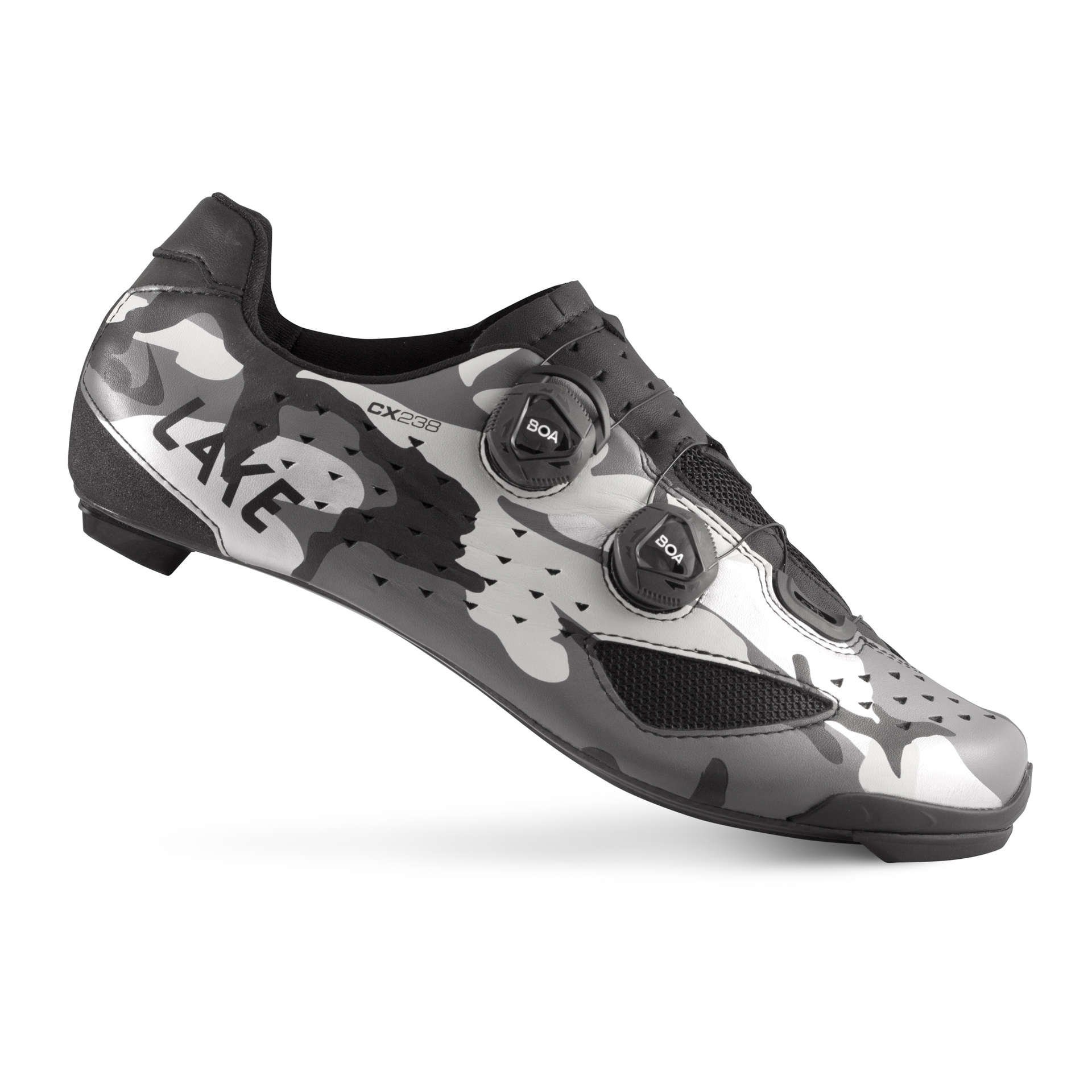 Deze Lake CX238 wielrenschoenen zijn zeer hoogwaardige schoenen voor zeer gedreven wielrenners. Deze schoen is bedoeld voor fietsers met een smalle tot gemiddelde voetbreedte. Door de zeer stijve carbon zool wordt al je kracht direct op de pedalen gebracht. Het slanke ontwerp sluit nauw om je voeten aan om beweging in de schoen tot een minimum te beperken, maar biedt wel voldoende ruimte om afknelling te voorkomen tijdens stukken waar je even moet rennen in een wedstrijd. Als aanvulling beschikken de schoenen over twee BOA sluitingen welke zeer precies af te stellen zijn. Hierdoor zal je altijd de perfecte pasvorm vinden. Om te zorgen dat je geen té warme voeten krijgt, zijn er perforaties in het bovenwerk aangebracht en extra mesh stukken toegevoegd. Daarnaast helpt de voering met het snel afvoeren van hitte en vocht. Het bovenwerk is gemaakt van slijtvast en waterafstotend leder met extra Aramide stukken op de meest blootgestelde delen zoals de hiel. De rubberen onderzool biedt veel grip in modderige omstandigheden, ideaal tijdens een wedstrijd waarbij je ook af en toe van de fiets af moet.