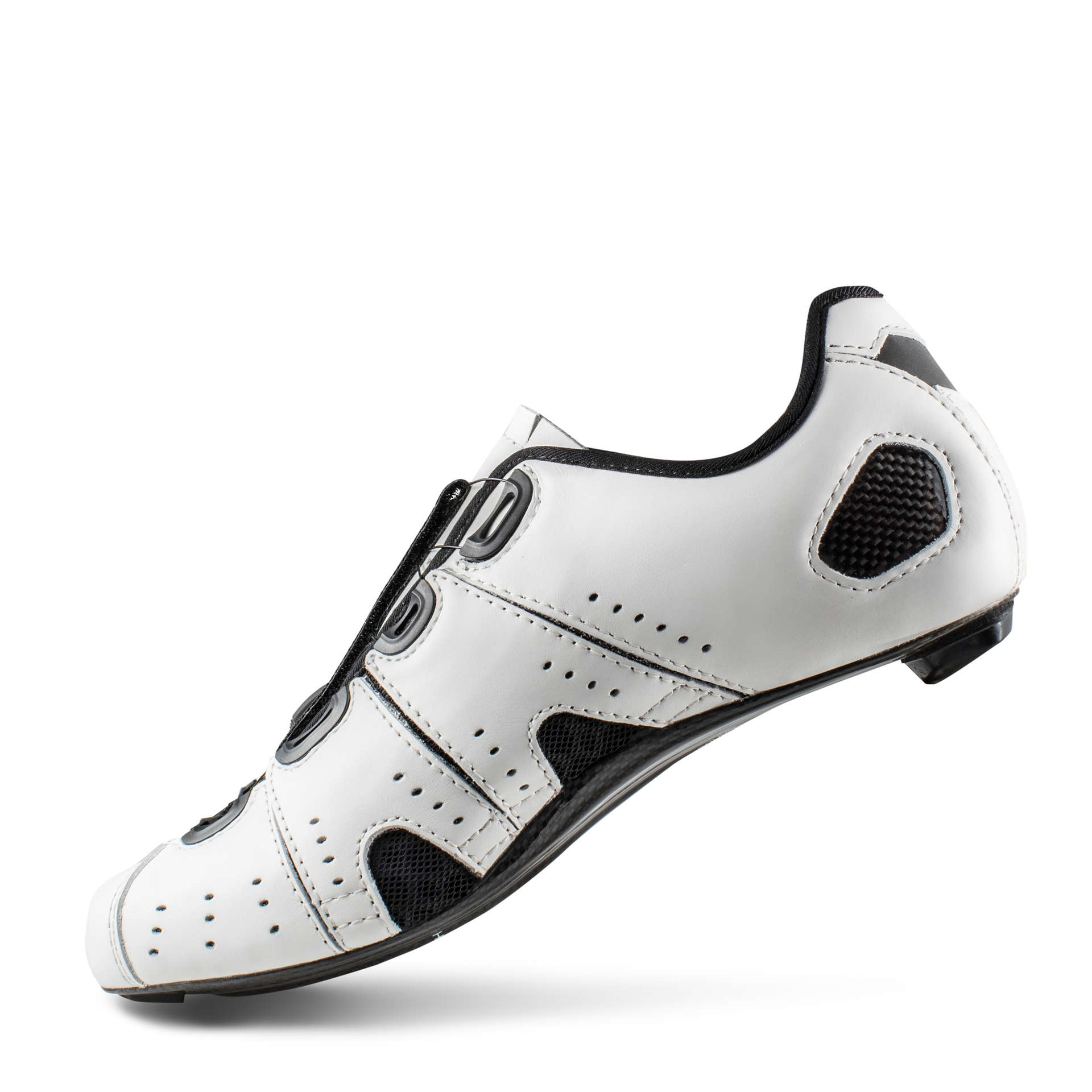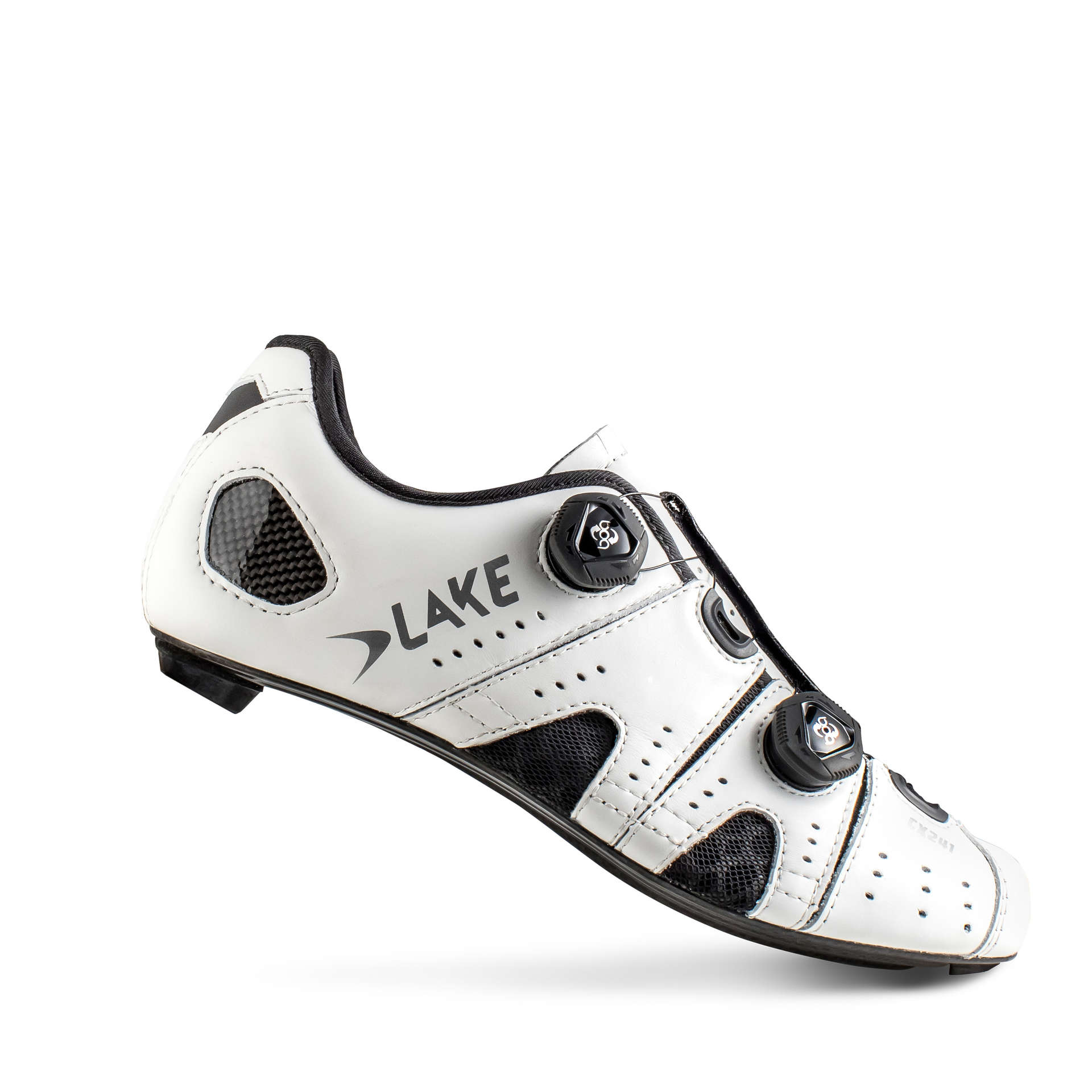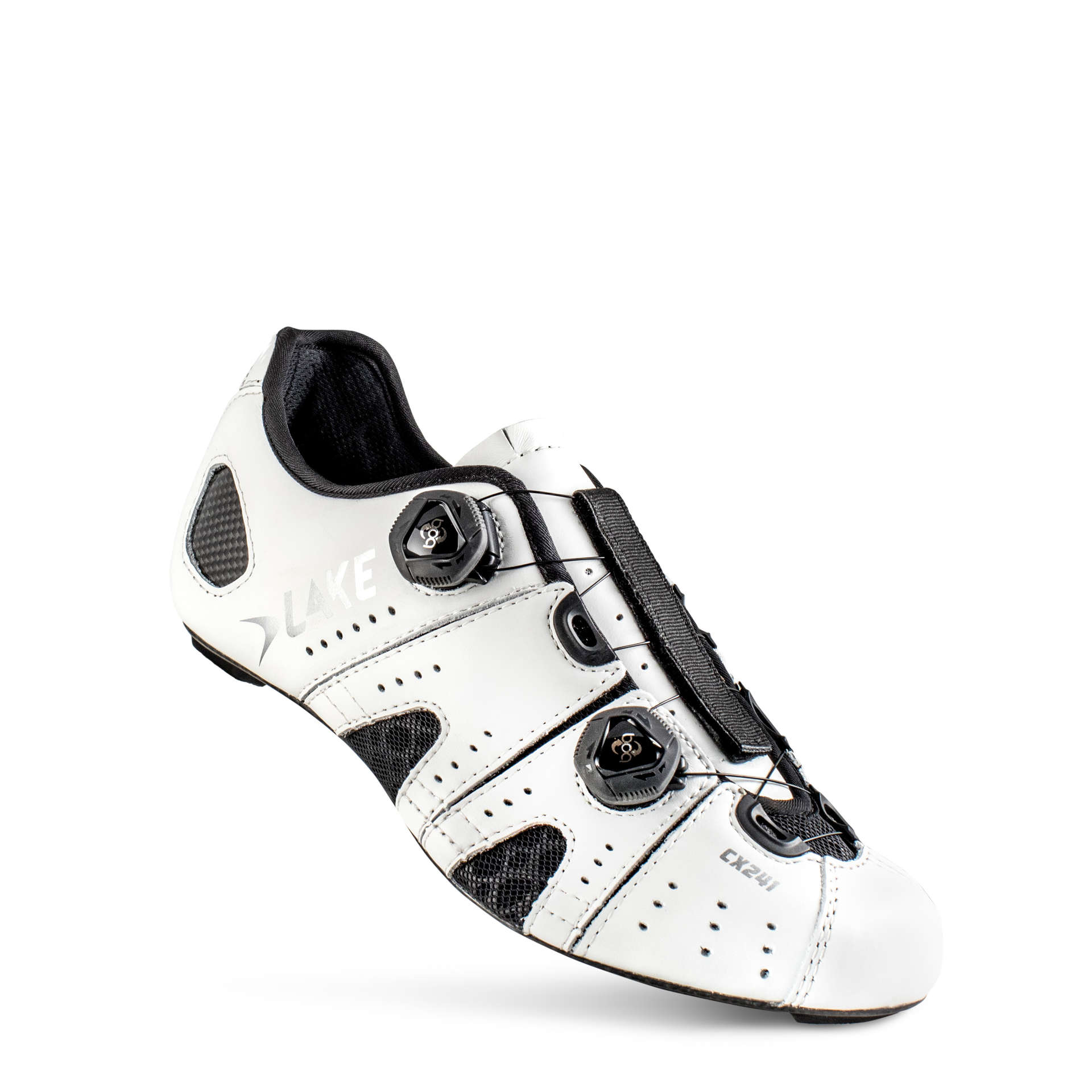 Deze Lake CX241 Raceschoenen voor heren zijn zeer hoogwaardige racefiets schoenen voorzien van een full carbon zool. Deze zool zorgt voor een laag gewicht en een zeer stijve schoen. Hierdoor is de krachtoverbrenging tussen de schoen en het pedaal zeer direct. Het lage gewicht en de stijve zool maken dit ideale schoenen voor hoge cadans training en uiteraard voor in de bergen. Het bovenwerk is gemaakt van slijtvast leer en is tevens voorzien van inzetstukken van mesh, welke de schoen een uitstekend ademend vermogen geven. De 2 BOA sluitingen zorgen ervoor dat je de schoen zeer precies op jou pasvorm kunt aanpassen. Doordat deze schoenen de bal van de voet de ruimte geeft om uit te zetten, zijn ze ideaal voor intensieve ritten. Waar constante druk op de voeten staat.