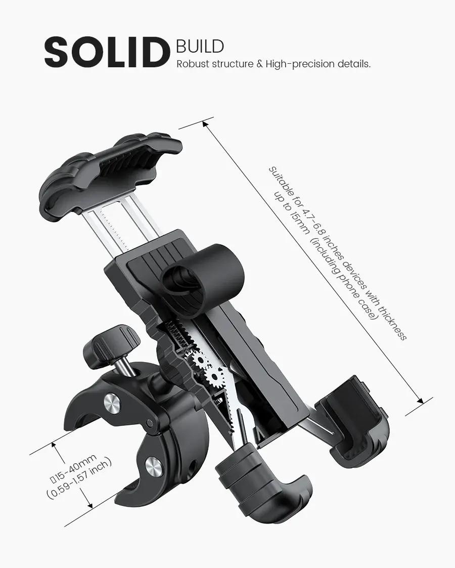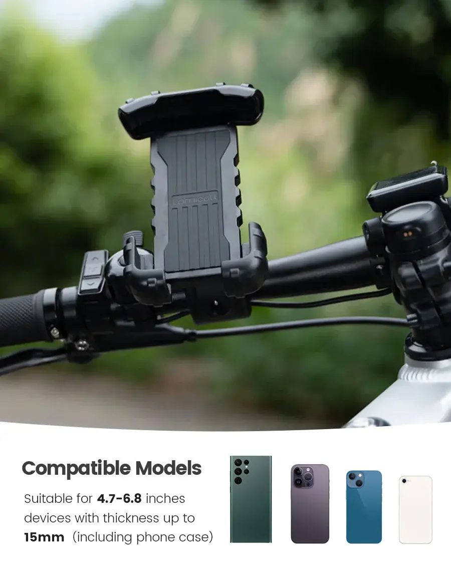 De Lamicall BP05 Smartphonehouder is de perfecte houder voor een ieder die zijn telefoon stevig op zijn fiets wilt meenemen en kunnen bedienen. De houder omsluit de telefoon volledig op de hoeken, zodat de telefoon beschermt is bij een eventuele val. Hierdoor blijft de smartphone ook uitstekend zitten in de houder. De siliconen pads voorkomen krassen en beschadigingen tijdens het rijden op hobbelige wegen. Met de klem kan je de telefoon vastzetten in de houder, waardoor je gerust op hobbelige gravelwegen kunt rijden. De houder is zowel horizontaal als verticaal te gebruiken en is compatibel met telefoons van 4.7 tot 6.8 inch. Met een maximale dikte van 15mm. De houder is zonder gereedschap te installeren en past op sturen tussen de 15 en 40mm in diameter.