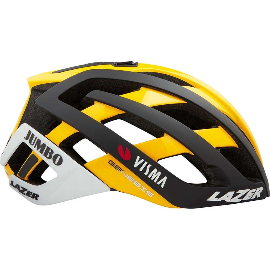 De Lazer Genesis Race fietshelm is dé keuze als je een tophelm wil die voornamelijk gemaakt is voor comfort. Deze Genesis komt in speciale Team Jumbo-Visma uitvoering, zodat jij je Jumbo-Visma outfit compleet kunt maken met helm! Zo fiets jij er net zo bij als alle helden van de dames- en herenploeg van de World Tour Ploeg. Uiteraard is de vorm van deze helm aerodynamisch, maar het vederlichte gewicht en de uitstekende ventilatie: daarin steekt de kracht van de Genesis. 22 ventilatiegaten zorgen voor voldoende frisse lucht voor je hoofdhuid. Sterker nog: de helm is zo gemaakt dat het frisse lucht aantrekt, waardoor je zelfs koeler blijft dan wanneer je geen helm draagt. Behalve comfort scoort hij ook veel punten op gebied van veiligheid. Een In Mold-constructie opgebouwd uit zes lagen zorgt voor een onovertroffen degelijkheid. Het Advanced Rollsys verstelsysteem zorgt voor een dusdanig goede aansluiting dat de helm altijd goed op je hoofd blijft zitten en je nooit kringen op je voorhoofd krijgt omdat hij net dat beetje te strak zit. Tot slot nog eens het gewicht: minder dan 200 gram voor een fietshelm! Ongekend!