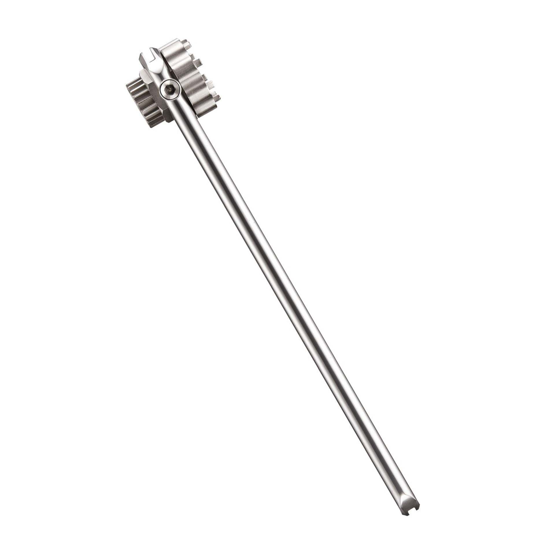 Met de extra lange CNC Rod Sleutel draai je in combinatie met een van de tools in de bundels eenvoudig je cassette of trapas los. Deze universele 32mm sleutel is ontworpen om te gebruiken in combinatie met de Trapas- en Cassette Lock Ring gereedschap. De CNC gefreesde aluminium sleutel is extra lang, voor extra gebruiksgemak. De gefreesde aluminium schroef klemt de tool in de sleutel. De schroef kan met de hand aangedraaid worden of met een 4mm inbus sleutel.