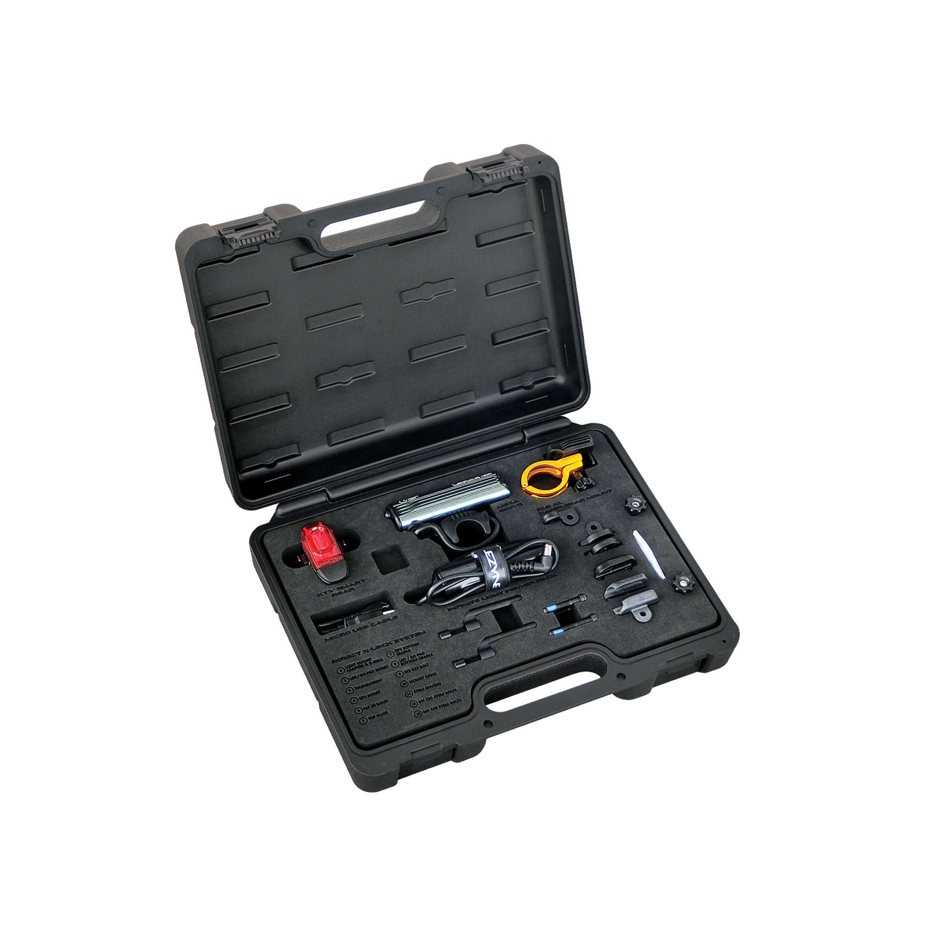 Deze uitgebreide verlichtingsset bevat een zeer sterke koplamp en achterlamp en bijbehorende accessoires. Alles wordt geleverd in een handige hardcase koffer.
