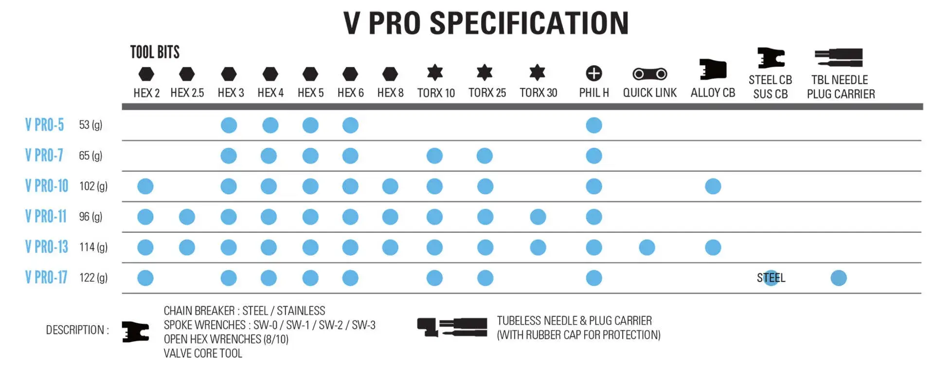 Lezyne V Pro 5 zwart is een geweldige multitool. Lekker compact, dus niet te zwaar en alles wat je nodig hebt voor pech onderweg zoals voor je steekas. Bevat Hex/inbus 3, 4. 5 en 6mm en kruis/Phillips kruis schroeven draaier. Perfect!!!