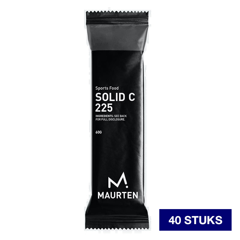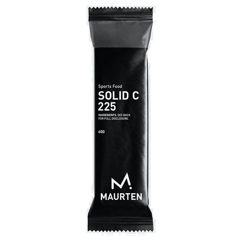 De Solide 225C sportreep van Maurten is een heel nieuwe kijk op sportvoeding. De reep is ontwikkeld door alles behalve de essentie van de voeding te verwijderen. Het resultaat is een prestatiegerichte kauwtablet op basis van haver en rijst. Deze reep zorgt daardoor voor een snelle en lichte koolhydraatrijke, vezelarme brandstof. De smaak van deze reep is zoet en neutraal en heeft een toevoeging van chocolade. De reep bevat 225 calorieën en 44 g koolhydraten.