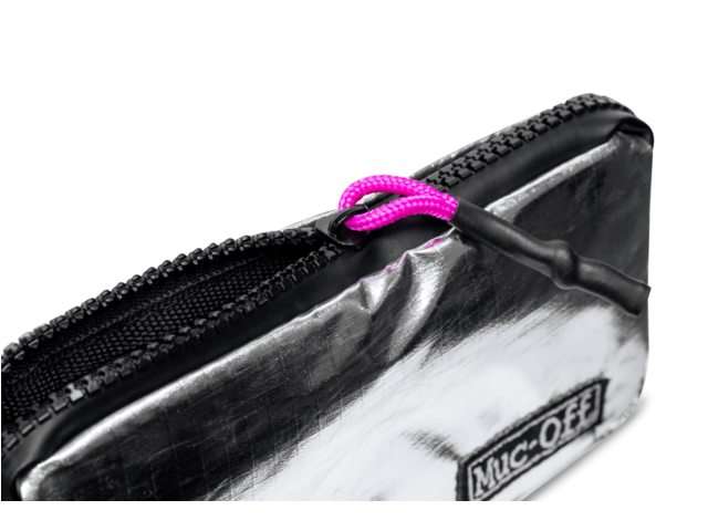 Is het een case? Ja. Is het een tasje? Ja. Superhandig en veelzijdig tasje waar je grote mobiel in past, iPhone XR met beschermhoes zit lekker snug in. Daarnaast een ritsvakje voor je bankpas en ID. En dan heb je nog ruimte voor drinktabletten, kleine zakjes Haribo en sleutels. Of stop hem vol met bandenlichters en binnenband. Mooi ding, maar je moet wel van de Muc-off uitstraling houden. Een zwarte met roze accenten had ook tof geweest. Oja, de lusjes aan de achterkant, kan je hem ook aan je riem hangen voor dagelijks utility gebruik.