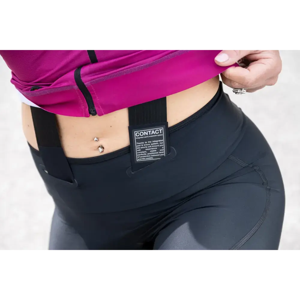De Contact fietsbroek voor dames is een revolutie in het ontwerp van fietsbroeken, dankzij het innovatieve geïntegreerde systeem van zeem en bretels, speciaal aangepast voor de vrouwelijke fietser. De nieuwe constructie herdefinieert concepten van pasvorm en comfort. De bretels zijn direct aan de zeem bevestigd, die gedeeltelijk los is van de broek. Hierdoor past de zeem zich natuurlijker aan het lichaam aan, wat een gepersonaliseerde pasvorm en meer bewegingsvrijheid biedt. De minimalistische bovenkant voorkomt overlappende stoffen, wat gewicht bespaart en ventilatie bevordert. Reflecterende logo's en een 5,5 cm elastische band met siliconen grippers maken het geheel af.